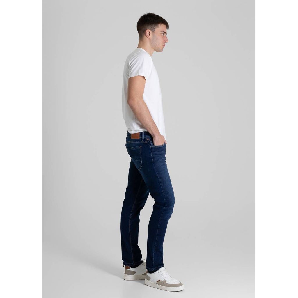 Calça slim confeccionada em jeans. Modelagem ajustada até a barra. Cintura média Fechamento com botão metálico e zíper Bolsos frontais e bolsos protetores Barra simples Modelagem: Men slim Tecido: Jeans Tipo de lavagem: Azul Cor: Azul médio Composição: 84% ALGODÃO 14% POLIÉSTER 02% ELASTANO