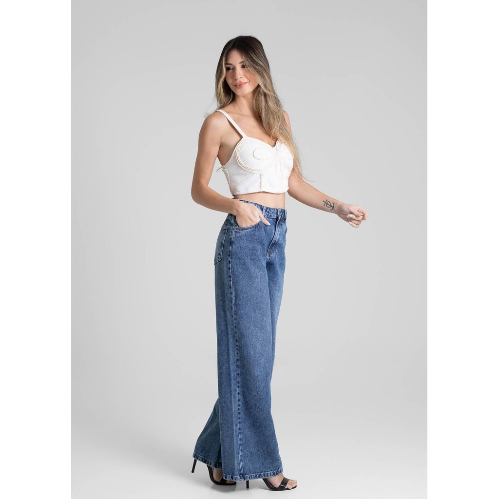 Calça feminina confeccionada em jeans. O modelo possui cintura super alta, gancho no lugar e caimento amplo da coxa até a barra. Cintura alta Fechamento através de um botão e zíper Bolsos frontais e posteriores funcionais Barra simples Tecido: Jeans Tipo de Lavagem: Azul Cor: Azul medio Composição: 100% ALGODÃO