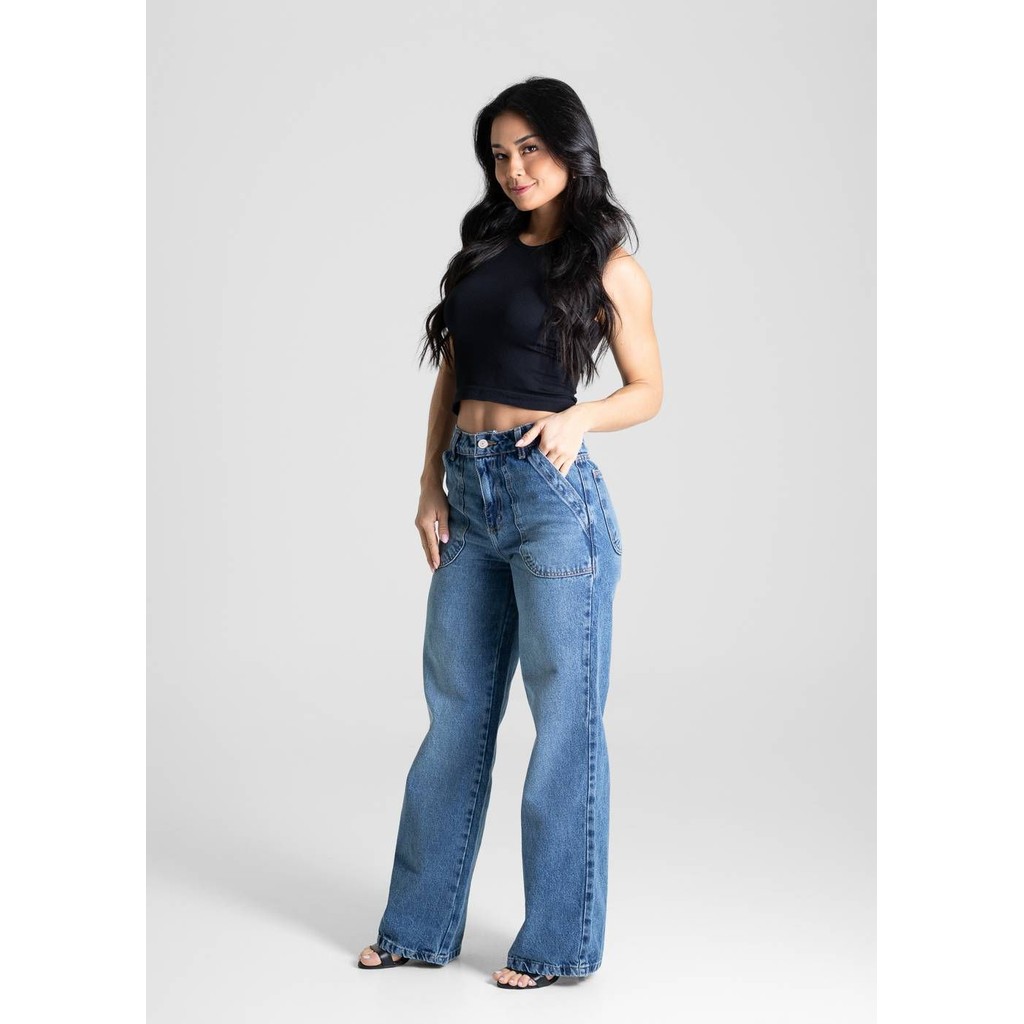 Calça feminina confeccionada em jeans. O modelo possui cintura super alta, gancho no lugar e caimento amplo da coxa até a barra. Cintura alta Fechamento através de um botão e zíper Bolsos frontais e posteriores funcionais Barra simples Tecido: Jeans Tipo de Lavagem: Azul Cor: Azul Composição: 100% ALGODÃO Tipo de lavagem: PLUMA