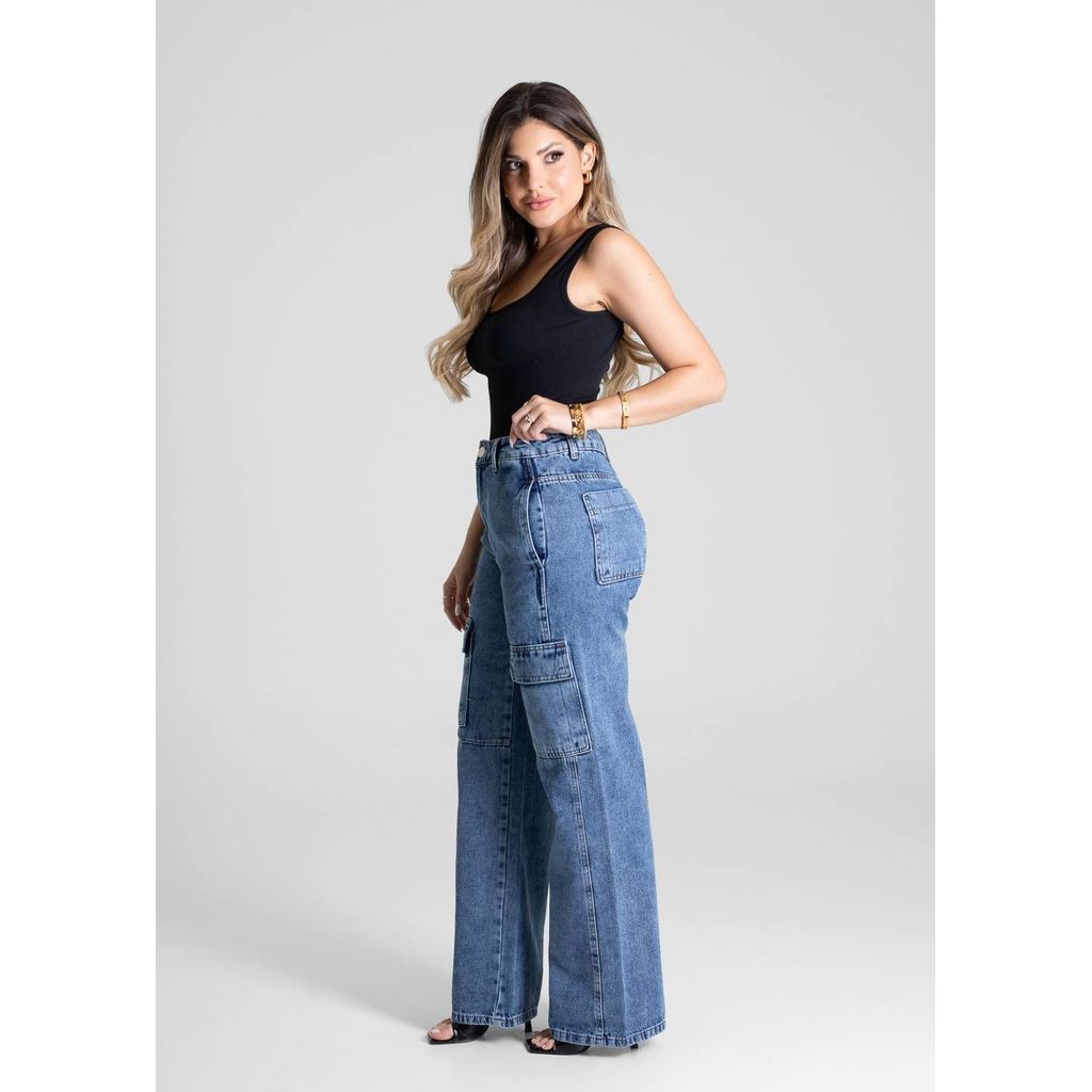 Calça feminina confeccionada em jeans. O modelo possui cintura super alta, gancho no lugar e caimento amplo da coxa até a barra. Cintura alta Fechamento através de um botão e zíper Bolsos frontais e posteriores funcionais bolsos cargo Barra simples Tecido: Jeans Tipo de Lavagem: Azul Cor: Azul Composição: 100% ALGODÃO Tipo de lavagem: PLUMA