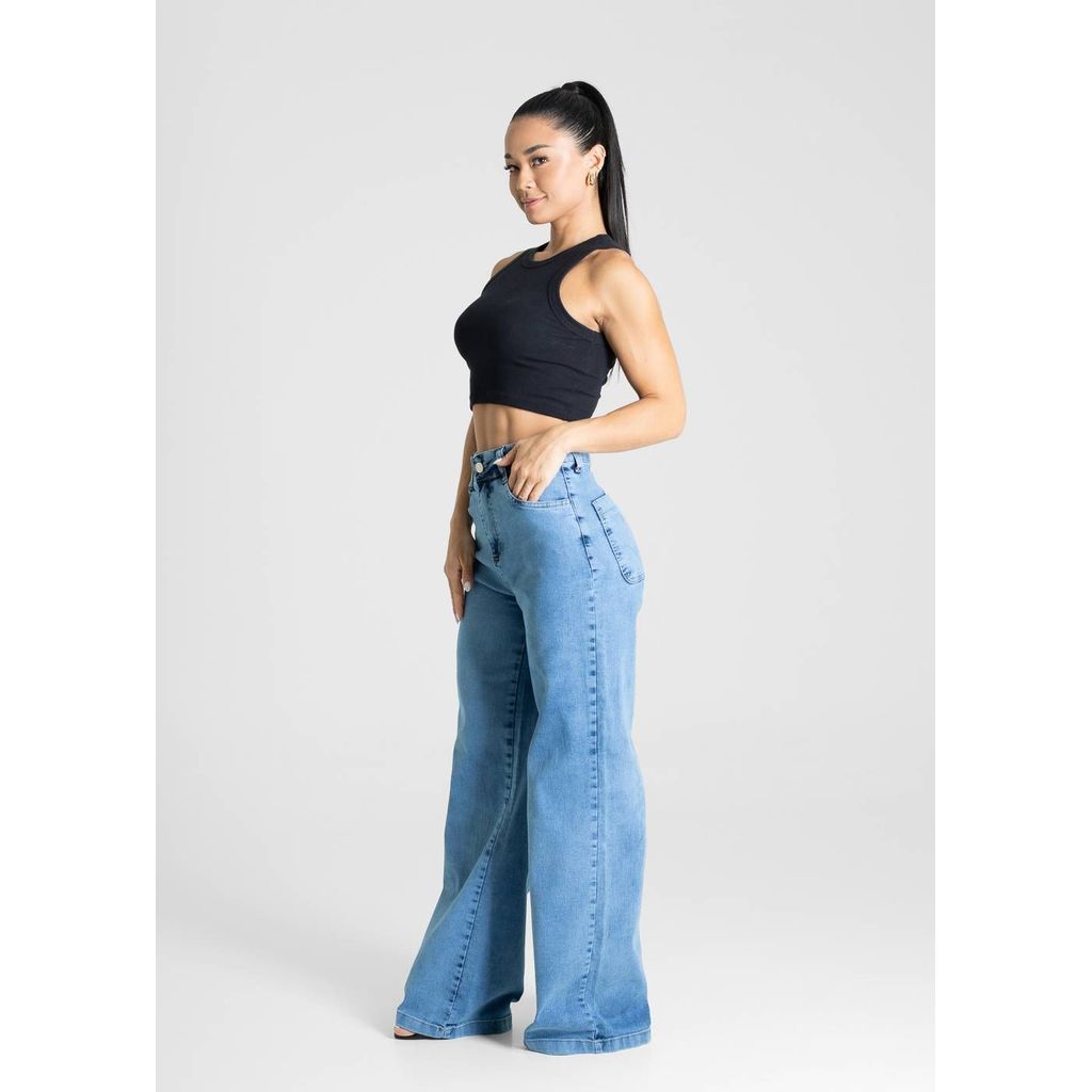 Calça feminina confeccionada em jeans. O modelo possui cintura super alta, gancho no lugar e caimento amplo da coxa até a barra. Cintura alta Fechamento através de um botão e zípe Bolsos frontais e posteriores funcionais Barra simples Tecido: Jeans Tipo de Lavagem: Azul Cor: Azul Composição: 80% ALGODÃO 18% POLIÉSTER 02% ELASTANO Tipo de lavagem: FINA ESTAMPA