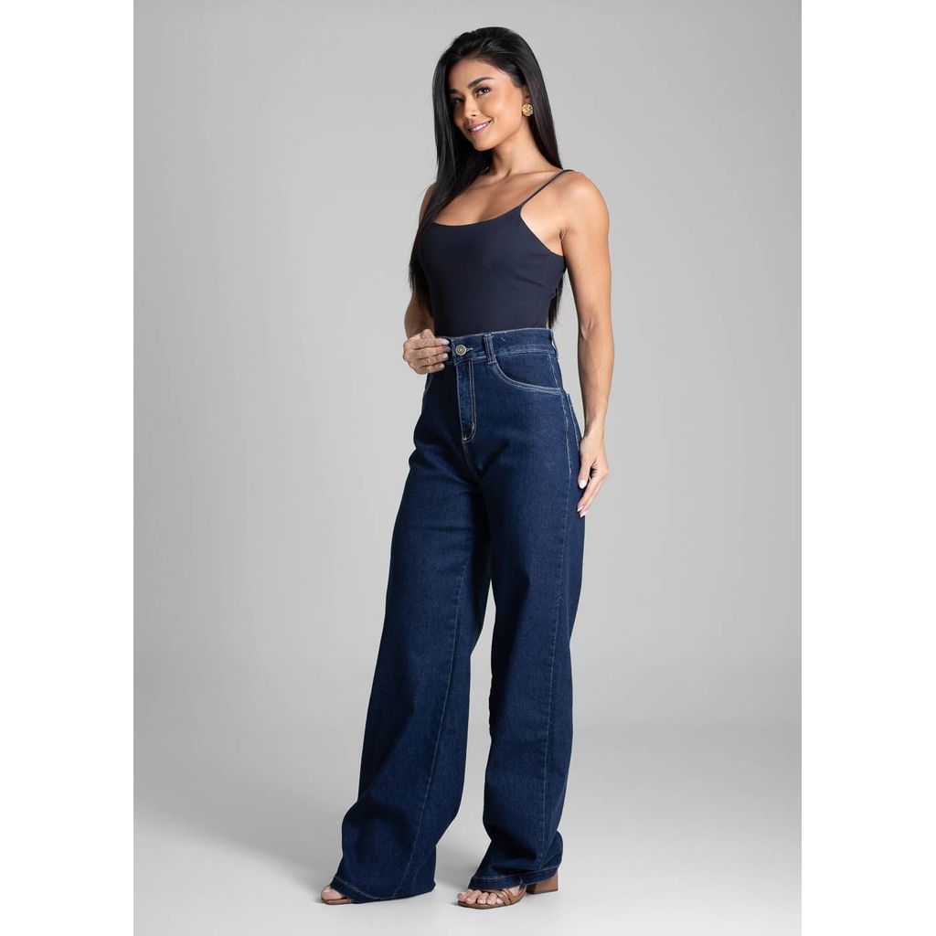 Calça feminina confeccionada em jeans. O modelo possui cintura super alta, gancho no lugar e caimento amplo da coxa até a barra. Cintura alta Fechamento através de um botão e zíper Bolsos frontais e posteriores funcionais Barra simples Tecido: Jeans Tipo de Lavagem: Azul Cor: Azul médio Composição: 67% ALGODÃO 31% POLIÉSTER 2% ELASTANO Tipo de lavagem: KENNELAN