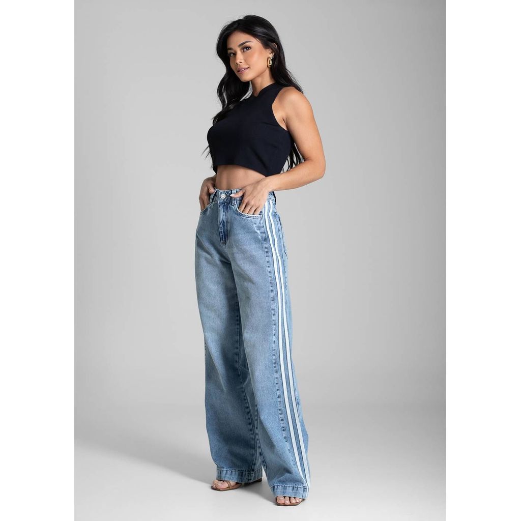 Calça feminina confeccionada em jeans. O modelo possui cintura super alta, gancho no lugar e caimento amplo da coxa até a barra. Cintura alta Fechamento através de um botão e zíper Bolsos frontais e posteriores funcionais Barra simples Tecido: Jeans Tipo de Lavagem: Azul Cor: Azul médio Composição: 100% ALGODÃO Tipo de lavagem: KENNELAN