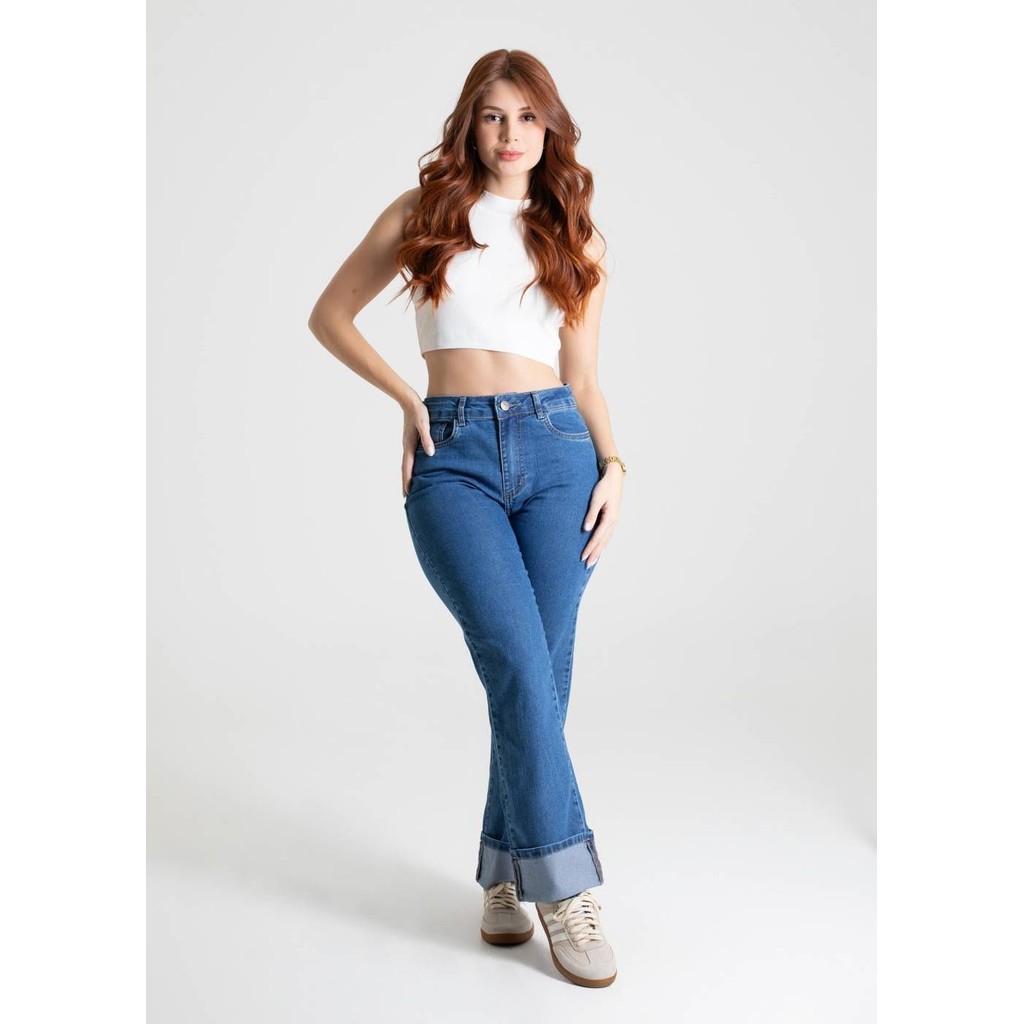 Calça feminina confeccionada em jeans. O modelo possui cintura super alta, gancho no lugar e caimento amplo da coxa até a barra. Cintura alta Fechamento através de um botão e zíper Bolsos frontais e posteriores funcionais Barra dobrada Tecido: Jeans Tipo de Lavagem: Azul Cor: Azul médio Composição: 83% ALGODÃO 15% POLIÉSTER 02% ELASTANO