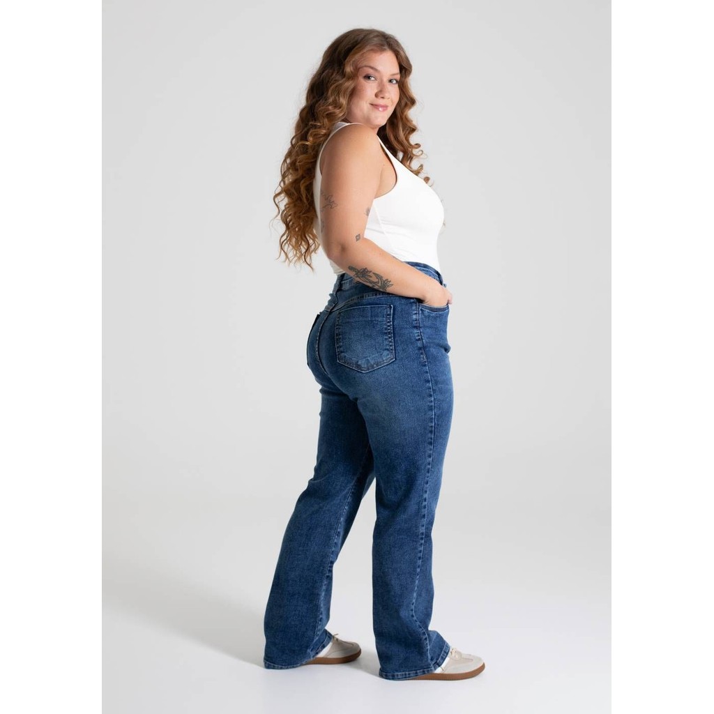 Calça feminina confeccionada em jeans. O modelo possui cintura super alta, gancho no lugar e caimento amplo da coxa até a barra. Cintura alta Fechamento através de um botão e zíper Bolsos frontais e posteriores funcionais Barra simples Tecido: Jeans Tipo de Lavagem: Azul Cor: Azul escuro Composição: 80% ALGODÃO 18% POLIÉSTER 02% ELASTANO Tipo de lavagem: ARAUJO