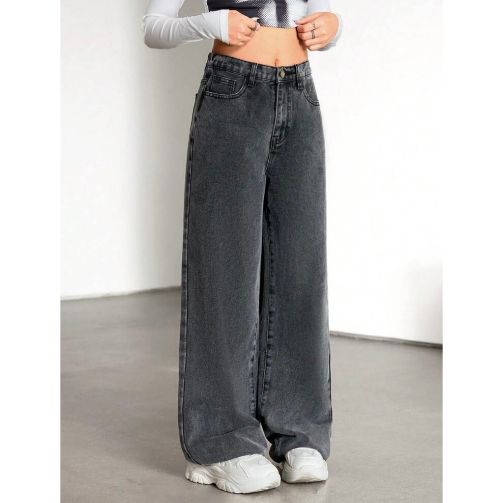 Calça Jeans Wide Leg Grafite Lisa Black Reta Baggy Feminina Infantil Juvenil Com Ajuste Blogueira Lançamento 10-16
