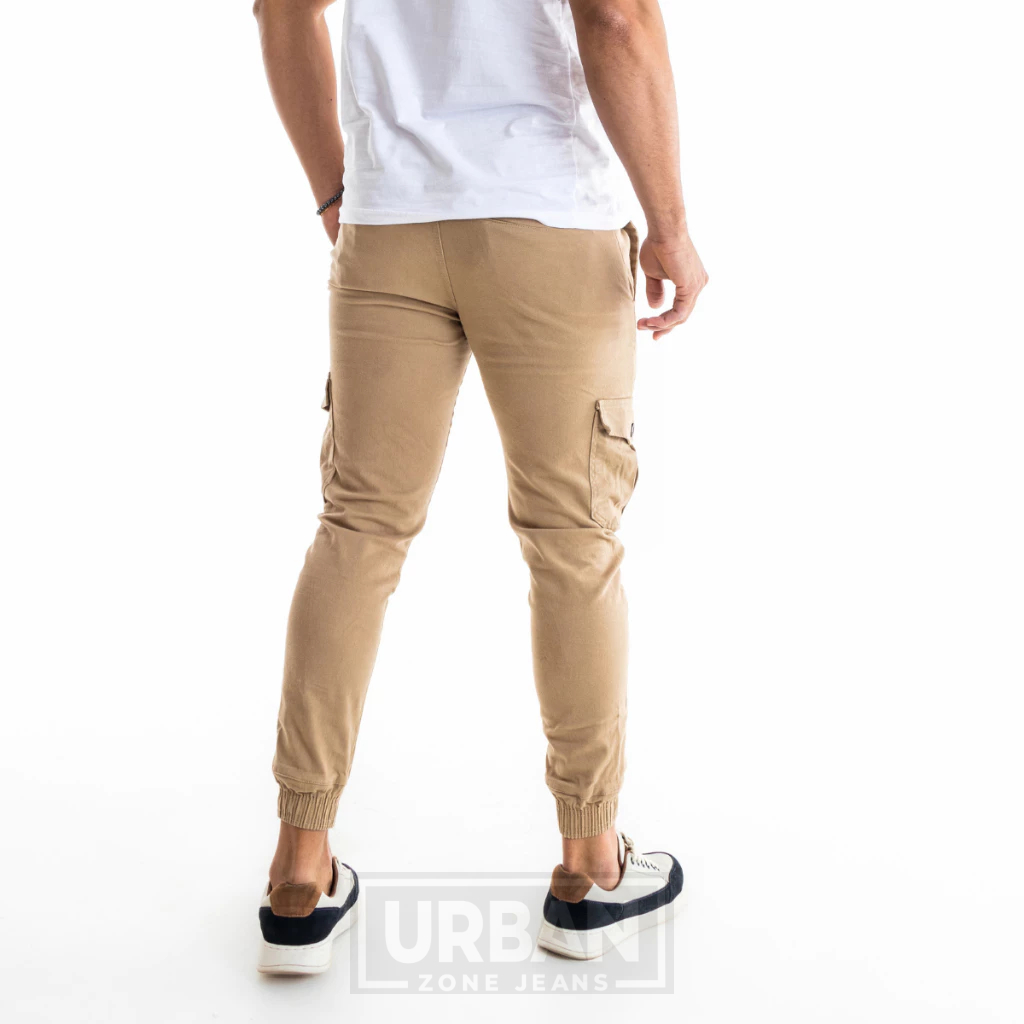 Calça Jogger Masculina Cargo Sarja Slim com Cordão Bolso Embutido Bolso Faca