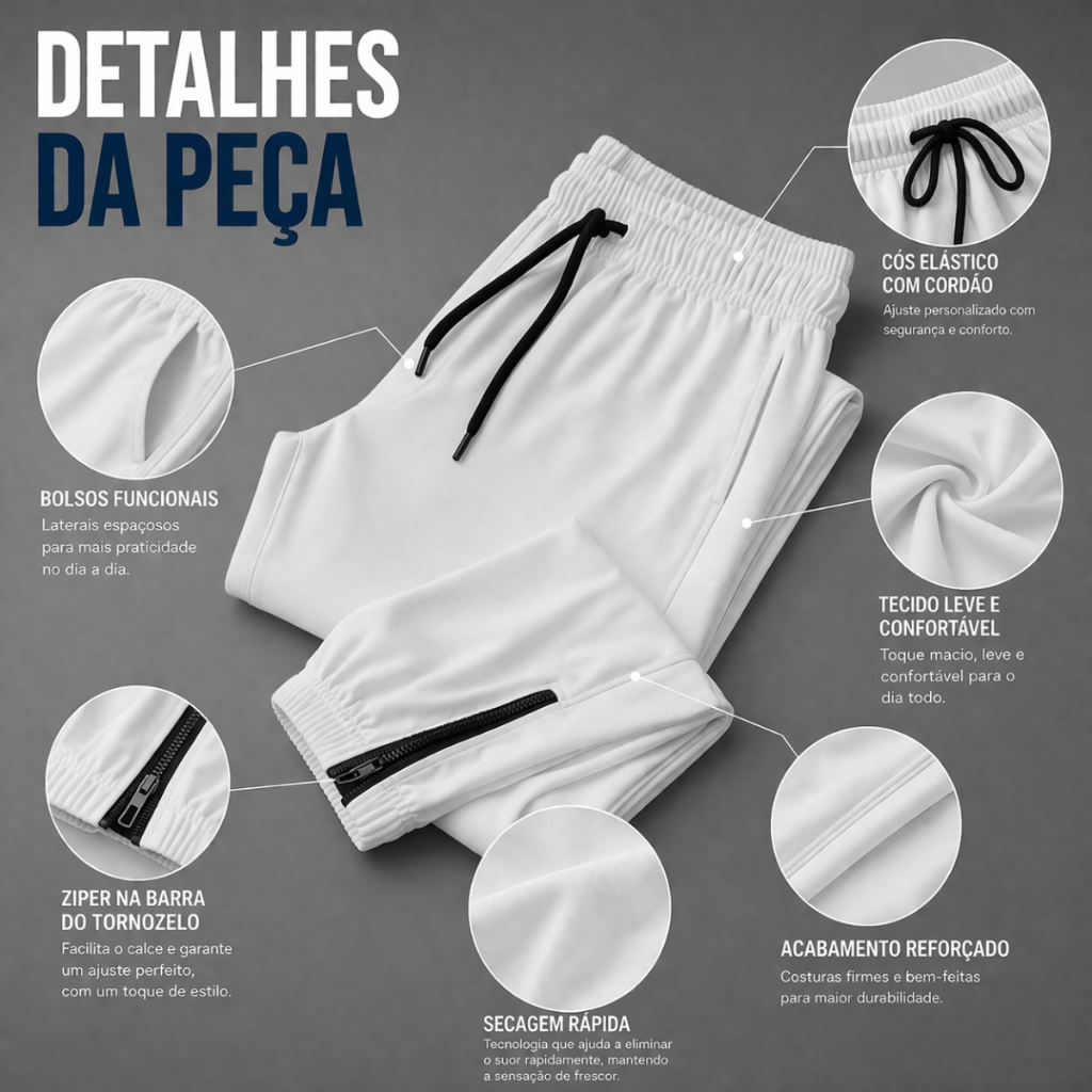 👖 Calça Jogger Masculina em Tactel com Elastano – Leve, Ajustável e Confortável A Calça Jogger Masculina em Tactel com Elastano é ideal para quem busca mobilidade, conforto e estilo esportivo moderno no dia a dia ou nos treinos. Produzida em tactel leve com elastano, ela oferece toque macio, acabamento liso e excelente liberdade de movimento. O tecido acompanha o corpo sem limitar, garantindo conforto tanto para atividades físicas quanto para uso casual. 🧵 Tecido e Conforto O material é leve, respirável e de secagem rápida, ajudando na transpiração natural do corpo durante o uso. ✔ Não pesa no corpo ✔ Não esquenta excessivamente ✔ Seca rápido ✔ Mantém o caimento após as lavagens ✔ Flexível graças ao elastano Ideal para quem precisa de conforto prolongado ao longo do dia. 🔒 Ajuste Seguro e Personalizado A cintura conta com elástico reforçado, que se adapta bem ao corpo sem apertar. O cordão externo com ponteiras reforçadas permite regulagem prática, oferecendo firmeza extra durante treinos, caminhadas ou corridas. Você ajusta uma vez e sente estabilidade durante o uso. 👖 Modelagem Slim Jogger A modelagem é slim jogger, com caimento alinhado ao corpo sem ficar colado. Valoriza a silhueta e mantém liberdade total. Na parte inferior, possui: ✔ Punho com elástico na barra ✔ Zíper lateral no tornozelo O zíper facilita ao vestir e retirar a peça, além de permitir ajuste na abertura da barra — ideal para quem usa tênis mais volumosos ou prefere ajuste personalizado. 📱 Praticidade no Dia a Dia Os bolsos laterais são profundos e funcionais, ideais para: Celular Carteira Chaves Uma peça versátil que funciona perfeitamente: Academia • Corrida • Caminhada • Treino funcional • Uso diário • Look casual esportivo 🌬 Respiração e Mobilidade O tecido favorece a ventilação e ajuda a manter o conforto mesmo em atividades intensas. A combinação de leveza + elasticidade garante liberdade total para agachamentos, deslocamentos e exercícios diversos. 🎨 Cores Disponíveis Preto Caqui Branco Azul Marinho Cinza Chumbo Cinza Claro 📏 Tamanhos Disponíveis P • M • G • GG Modelagem confortável e equilibrada para diferentes biotipos. ⭐ Por que escolher essa jogger? ✔ Leveza e conforto ✔ Ajuste personalizado na cintura ✔ Zíper funcional na barra ✔ Visual moderno e esportivo ✔ Ideal para treino ou uso casual Uma calça pensada para acompanhar sua rotina com liberdade, praticidade e estilo.