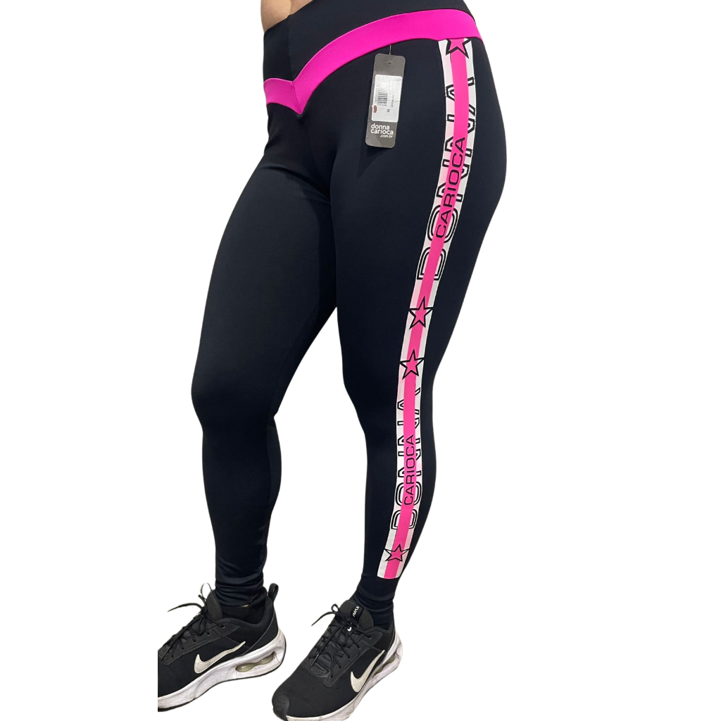 ✨ Legging Original ✨ Conforto, estilo e qualidade para os seus treinos e também para o dia a dia! 🔹 Diferenciais: Cós alto em formato V, que valoriza a cintura e garante firmeza. Estampa lateral com detalhe em rosa neon + estrelas, moderna e estilosa. Tecido de alta compressão, modela sem apertar. Ideal para academia, corrida, treino funcional ou uso casual. Não fica transparente e oferece ótima elasticidade. 📏 Tamanhos disponíveis: P | M | (Cor: Preta com detalhe rosa e estampa "Carioca") ✅ Marca: Donna Carioca ✅ Produto novo e original