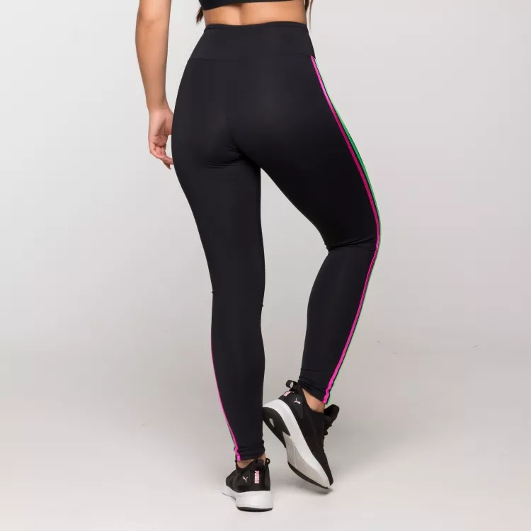 Calça Legging Fitness Feminina Academia Poliamida Preta com Detalhe Verde e Rosa Berlim