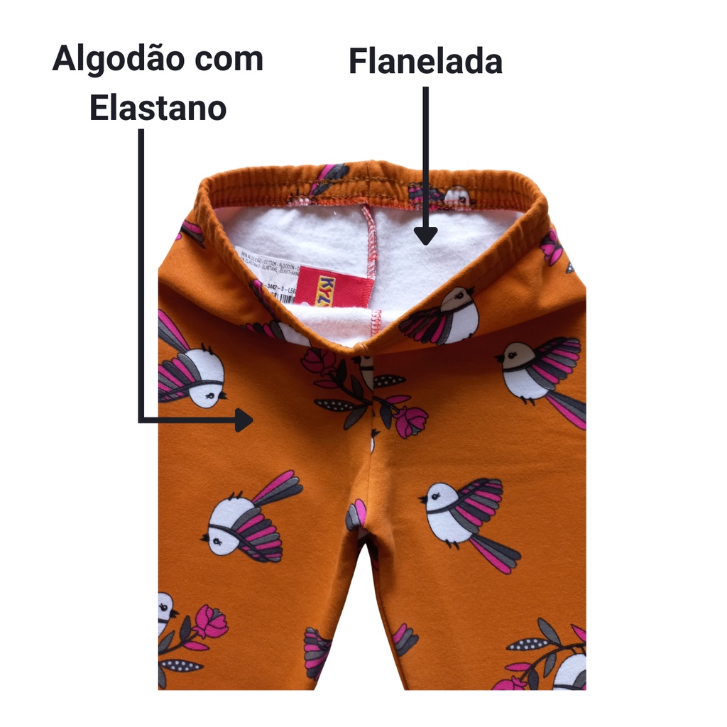 Calça Legging Kyly Flanelada - O kit é composto por 3 peças do mesmo tamanho e estampas sortidas. - As estampas são enviadas variadas, conforme disponibilidade do estoque. - O kit não possui estampas repetidas. Composição: - 96% algodão 4% elastano Tabela de Tamanhos: Tamanho 1: Comprimento Perna 40 cm Tamanho 2: Comprimento Perna 46 cm Tamanho 3: Comprimento Perna 51 cm Tamanho 4: Comprimento Perna 57 cm Tamanho 6: Comprimento Perna 64 cm Tamanho 8: Comprimento Perna 69 cm