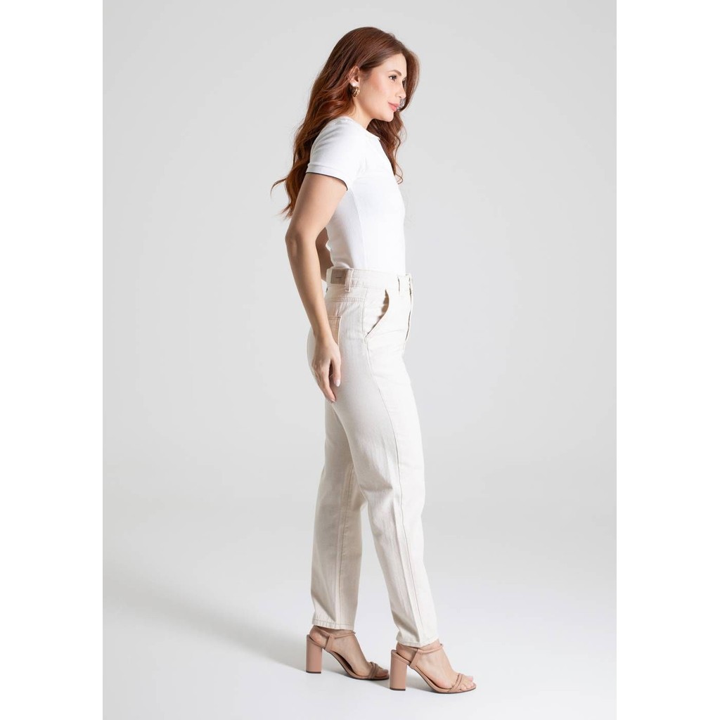 Calça mom confeccionada em linho. A modelagem mom tem um caimento soltinho nos quadris e coxas ajustando até o tornozelo. Cintura alta Fechamento com botão e zíper Bolsos frontais e bolsos traseiros funcionais Barra simples Modelagem: Mom Tecido: Linho Cor: Bege Composição: 86% ALGODÃO 14%LINHO Tipo de lavagem: AMACIADO