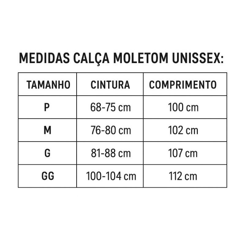 CALÇA DE MOLETOM UNISSEX – CONFORTO E ESTILO PARA O DIA A DIA Se você procura conforto, qualidade e caimento perfeito, essa calça de moletom é ideal para você! Produzida com tecido premium, é macia, resistente e perfeita para usar em casa, no treino, trabalho ou passeio. DETALHES DO PRODUTO: - Tecido Premium de alta qualidade - Dois bolsos laterais funcionais - Cordão ajustável na cintura - Estampa de alta durabilidade - Modelagem unissex, confortável e estilosa MEDIDAS (CINTURA X COMPRIMENTO): P (34-36): 68-75 cm | 100 cm M (38-40): 76-80 cm | 102 cm G (42-44): 81-88 cm | 107 cm GG (46-48): 100-104 cm | 112 cm COMPOSIÇÃO DO TECIDO: 70% Algodão 30% Poliéster Ideal para quem busca conforto, estilo e durabilidade em qualquer ocasião!