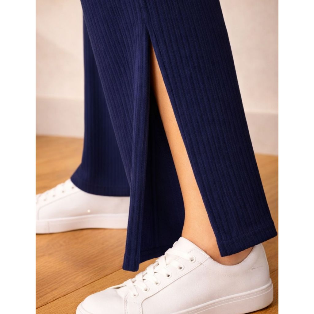 Calça Pantalona Feminina Cintura Alta Wide Leg Canelada com Fenda Lateral e Bolso – Moda Casual