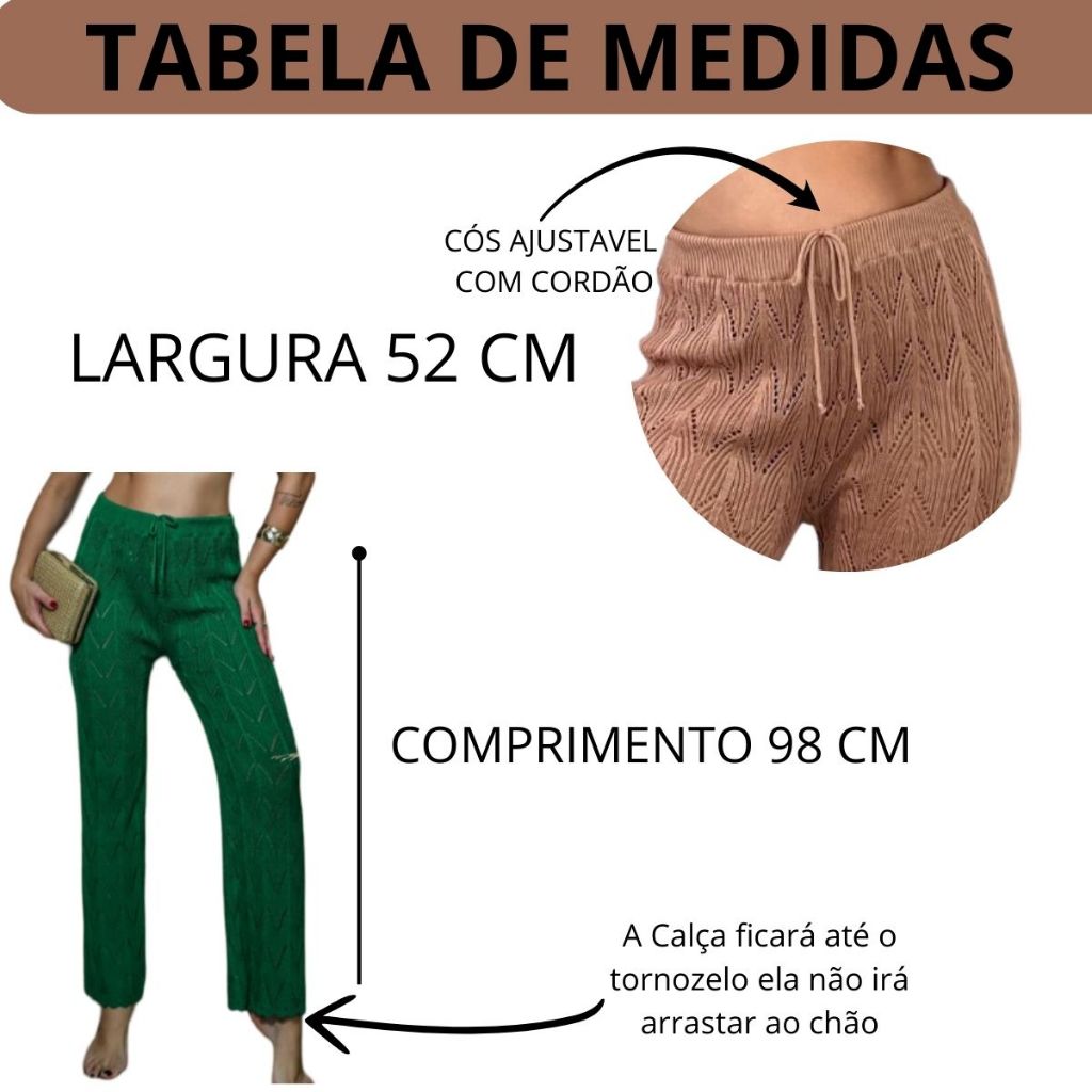 OBSERVAÇÕES IMPORTANTES : AS CORES PODEM VARIAR A TONALIDADE DEVIDO AS TELAS DE CELULARES E COMPUTADORES!!!! Descrição: Destaque-se neste verão com a Calça Foliada Saída de Praia Pantalona Cintura Alta , uma peça sofisticada e versátil. Confeccionada com fio 100% poliéster importado de alta tecnologia , essa calça oferece um caimento leve e fluido, ideal para qualquer ocasião. 💎 Detalhes que fazem a diferença: ✅ Cintura Alta Ajustável: Cós com amarração regulável, permitindo um ajuste perfeito ao corpo. ✅ Veste até o tamanho 46: Modelagem ampla e confortável, adaptável a diversos biotipos. ✅ Comprimento de 98 cm: Ideal para um caimento elegante e sofisticado. ✅ Acabamento em Nervura: Garante um toque refinado e diferenciado à peça. ✅ Tecido Respirável: Tricot crochê leve, perfeito para dias ensolarados. 🔥 Combine com biquínis, bodys ou croppeds e crie produções incríveis para o verão! 🌴 Versátil e estilosa, essa calça é ideal para saída de praia, passeios ou eventos ao ar livre. Combine com sua moda praia favorita e arrase! 🛍 Aproveite e garanta já a sua! 📦 Envio Rápido! Enviamos em até 24 horas úteis após a confirmação do pagamento, garantindo agilidade na entrega.