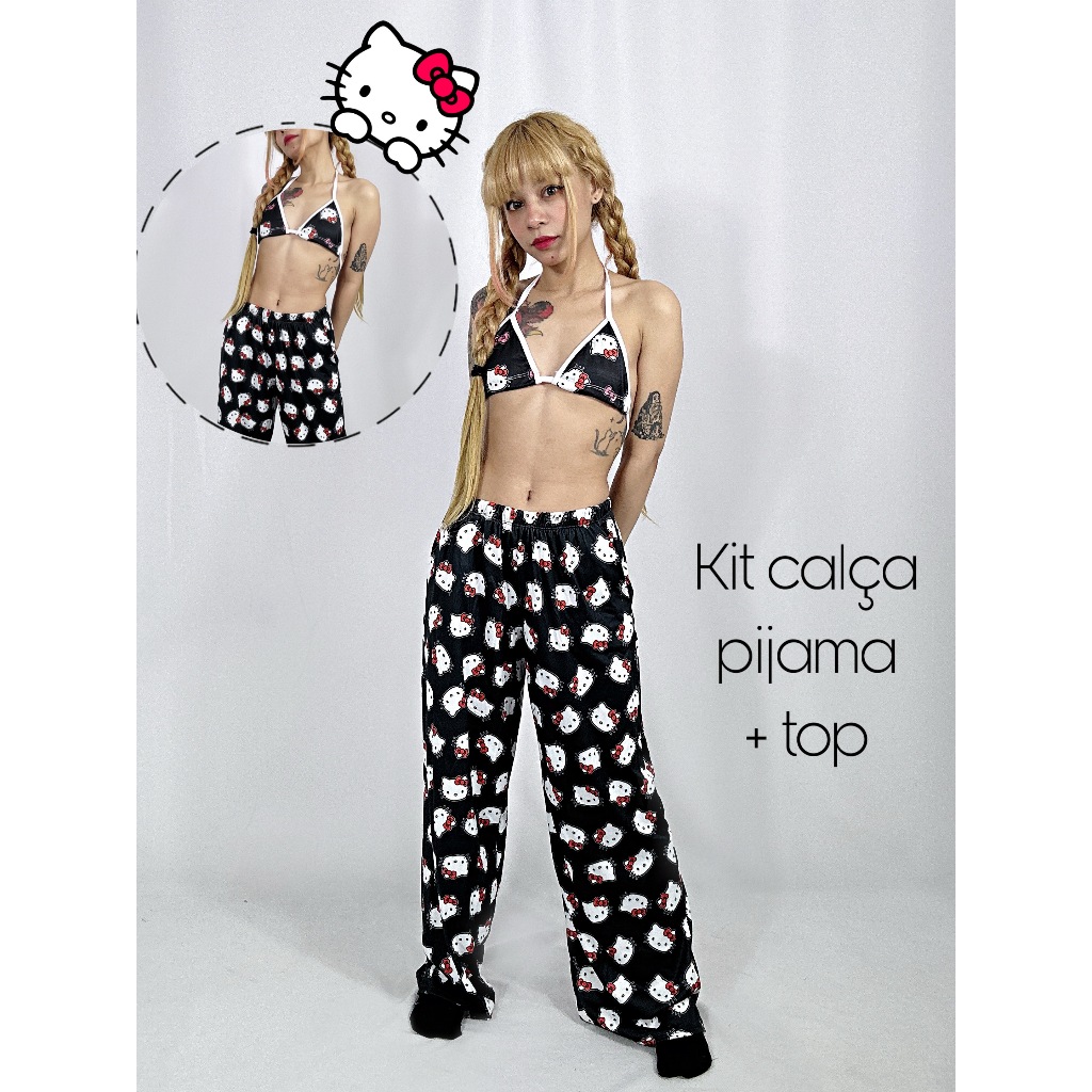 calça pijama com top temática da Hello Kitty, Kuromi, Hello Kitty e e Xadrez