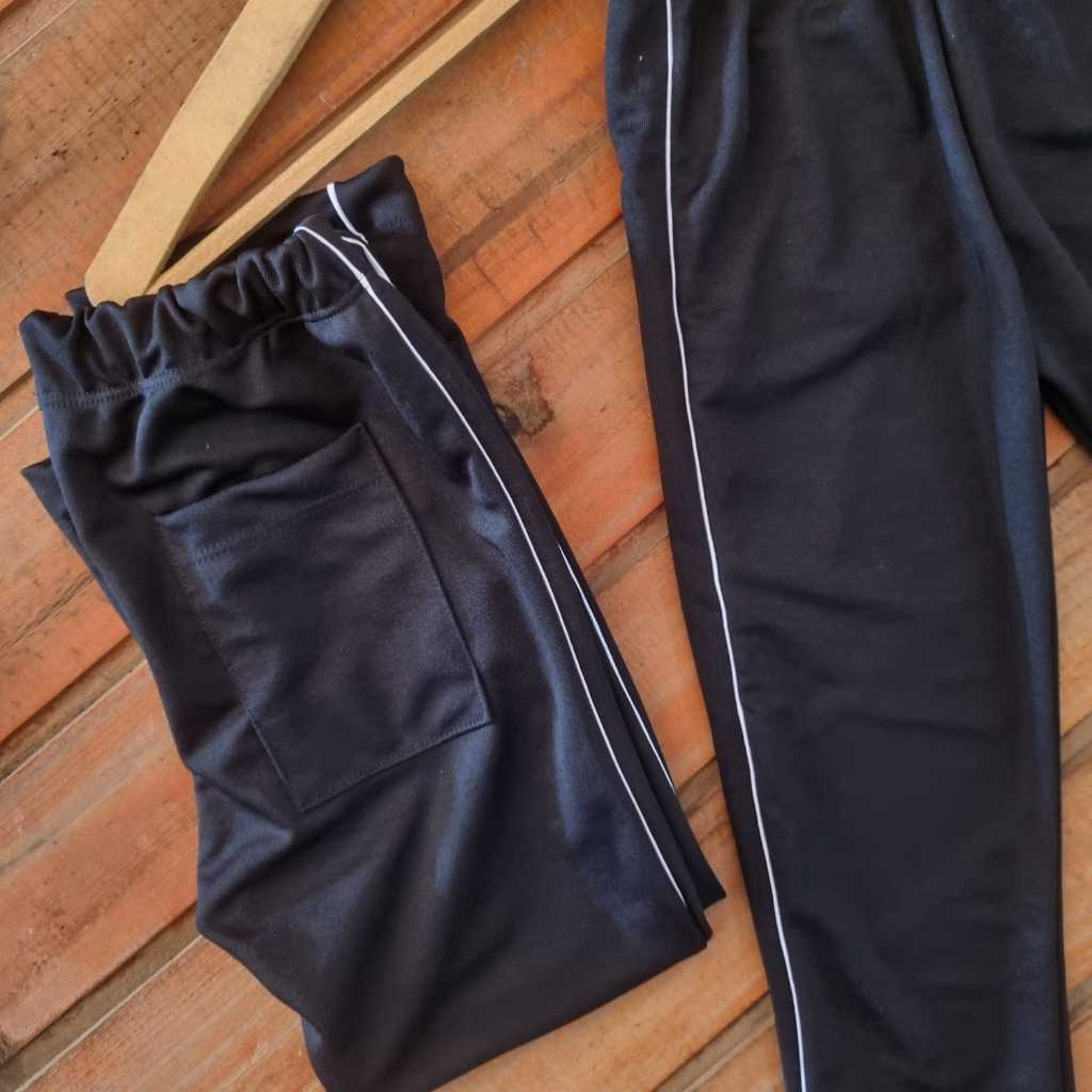 Calça helanca 100% poliéster PRETA unissex com friso branco nas laterais e bolso traseiro. Infantil e juvenil. Escolar...