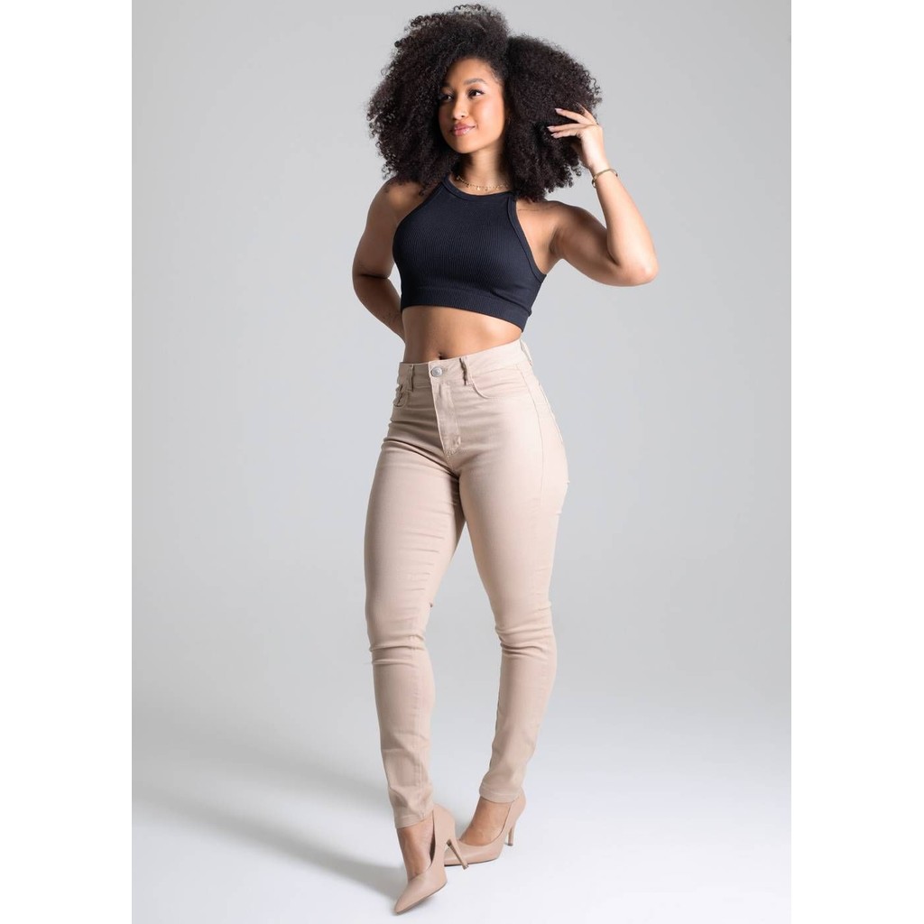 Calça levanta bumbum confeccionada em sarja. A modelagem tem quatro pences que valorizam as formas. Cintura médio Fechamento com botão metálico e zíper Bolsos frontais falsos e bolsos traseiros funcionais Barra simples Tecido: Sarja Tipo de lavagem: Color Cor: bege Composição: 73% Algodão 245 Poliéster 3% Elastano