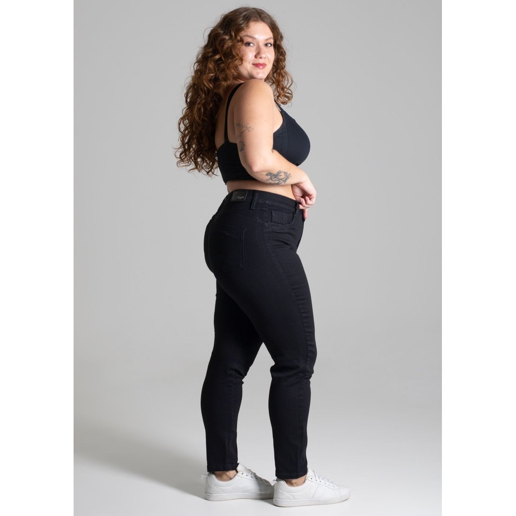Calça plus size confeccionada em sarja. A modelagem cigarrete, sendo ajustado ao corpo até a altura do tornozelo. Cintura alta Fechamento com botão metálico e zíper Bolsos frontais falsos e bolsos traseiros funcionais Barra simples Modelagem: cigarrete Tecido: Sarja Tipo de lavagem: Color Cor: Preta Composição: 73% Algodão 24% Poliéster 3% Elastano