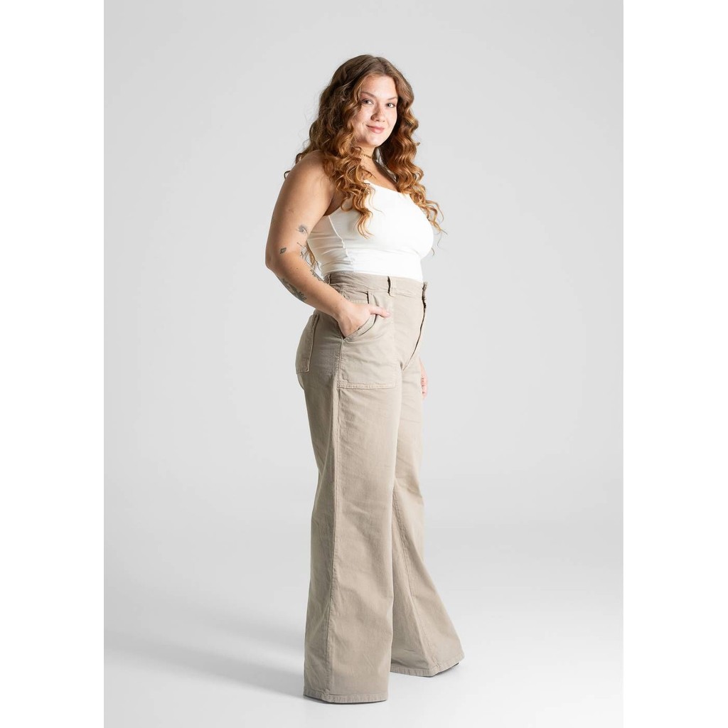 Calça feminina confeccionada em sarja.O modelo pantalona possui cintura alta, gancho no lugar e caimento amplo da coxa até a barra. Cintura alta Bolsos frontais e posteriores funcionais Barra simples Tecido: sarja Tipo de Lavagem: color Cor:caqui Composição: 98% ALGODÃO 02% ELASTANO Tipo de lavagem: VAY VAY
