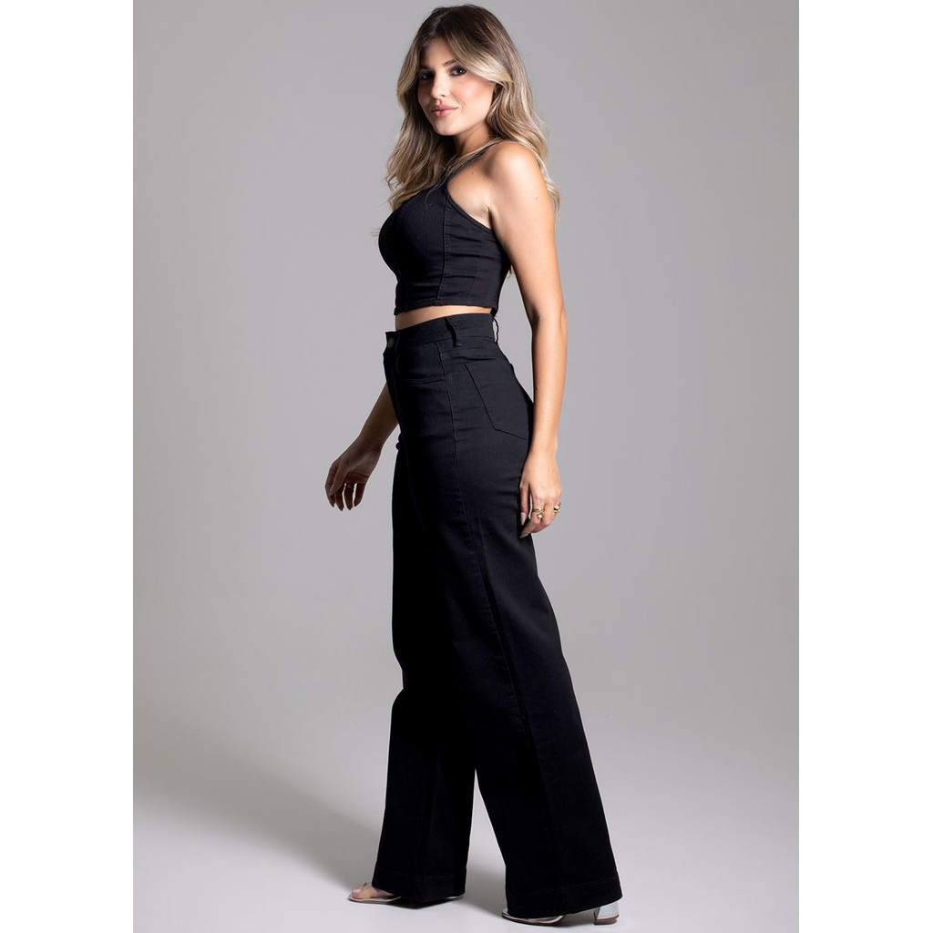 Calça feminina confeccionada em sarja. O modelo possui cintura super alta, gancho no lugar e caimento amplo da coxa até a barra. Cintura alta Fechamento através de um botão e zíper Bolsos frontais e posteriores funcionais Barra simples Tecido: Sarja Tipo de Lavagem: Color Cor: Preto Composição 73% Algodão 24%Poliéster 3%Elastano