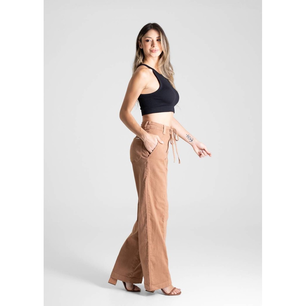 Calça feminina confeccionada em sarja. O modelo possui cintura super alta, gancho no lugar e caimento amplo da coxa até a barra. Cintura alta Fechamento através de um botão e zíper.cós acompanha um cordão com o mesmo tecido para amarração Bolsos frontais e posteriores funcionais Barra simples Tecido: Sarja Tipo de Lavagem: Color Cor: Marrom claro Composição: 73% ALGODÃO 24% POLIÉSTER 3% ELASTANO