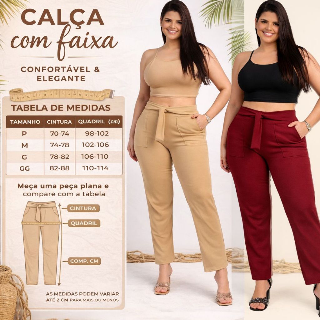 CALÇA DE ALFAIATARIA SOCIAL FEMININA COM LACINHO – ELEGÂNCIA, CONFORTO E SOFISTICAÇÃO A CALÇA DE ALFAIATARIA SOCIAL COM LACINHO É A ESCOLHA PERFEITA PARA MULHERES QUE BUSCAM ELEGÂNCIA, CONFORTO E ESTILO EM UMA ÚNICA PEÇA. COM MODELAGEM MODERNA E CINTURA ALTA, ELA VALORIZA A SILHUETA E PROPORCIONA UM CAIMENTO IMPECÁVEL. O DETALHE DO LACINHO NA CINTURA TRAZ UM TOQUE DELICADO E FEMININO, DEIXANDO O VISUAL MAIS SOFISTICADO E ATUAL. IDEAL PARA TRABALHO, EVENTOS, PASSEIOS OU ATÉ MESMO PARA UM LOOK CASUAL CHIQUE, ESSA CALÇA SE ADAPTA FACILMENTE A DIFERENTES ESTILOS. COMBINADA COM CAMISA, BLUSA OU CROPPED, ELA GARANTE UM VISUAL ELEGANTE E CHEIO DE PERSONALIDADE. O TECIDO POSSUI EXCELENTE CAIMENTO, É CONFORTÁVEL NO CORPO E PERMITE LIBERDADE DE MOVIMENTOS DURANTE TODO O DIA. TABELA DE MEDIDAS APROXIMADAS TAMANHO P CINTURA: 68 A 74 CM QUADRIL: 94 A 100 CM COMPRIMENTO: 100 CM TAMANHO M CINTURA: 74 A 80 CM QUADRIL: 100 A 106 CM COMPRIMENTO: 102 CM TAMANHO G CINTURA: 80 A 86 CM QUADRIL: 106 A 112 CM COMPRIMENTO: 104 CM TAMANHO GG CINTURA: 86 A 94 CM QUADRIL: 112 A 120 CM COMPRIMENTO: 106 CM BENEFÍCIOS DA CALÇA DE ALFAIATARIA COM LACINHO MODELAGEM QUE VALORIZA O CORPO A CINTURA ALTA AJUDA A ALONGAR A SILHUETA E DESTACA AS CURVAS DE FORMA ELEGANTE. DETALHE SOFISTICADO O LACINHO NA CINTURA TRAZ UM CHARME ESPECIAL À PEÇA, DEIXANDO O LOOK MAIS FEMININO E ESTILOSO. CONFORTO PARA O DIA TODO TECIDO MACIO E COM ÓTIMO CAIMENTO, PERFEITO PARA USO PROLONGADO SEM PERDER O CONFORTO. VERSATILIDADE PARA DIVERSOS LOOKS COMBINA COM CAMISAS SOCIAIS, BLUSAS BÁSICAS, CROPPEDS E BLAZERS, PERMITINDO CRIAR DESDE LOOKS PROFISSIONAIS ATÉ PRODUÇÕES MAIS MODERNAS. ESTILO ATEMPORAL A CALÇA DE ALFAIATARIA NUNCA SAI DE MODA. É UMA PEÇA ESSENCIAL NO GUARDA-ROUPA FEMININO. IDENTIDADE DE ELEGÂNCIA ESTA CALÇA REPRESENTA A MULHER MODERNA QUE VALORIZA ESTILO, PRESENÇA E SOFISTICAÇÃO. UMA PEÇA QUE TRANSMITE CONFIANÇA, CLASSE E PERSONALIDADE EM QUALQUER OCASIÃO. AO VESTIR ESSA CALÇA DE ALFAIATARIA COM LACINHO, VOCÊ NÃO ESTÁ APENAS USANDO UMA ROUPA, MAS SIM EXPRESSANDO UM ESTILO ELEGANTE, ATUAL E CHEIO DE ATITUDE. UMA PEÇA PENSADA PARA MULHERES QUE GOSTAM DE SE SENTIR BEM, BONITAS E SEGURAS EM TODOS OS MOMENTOS. PALAVRAS-CHAVE MAIS PROCURADAS