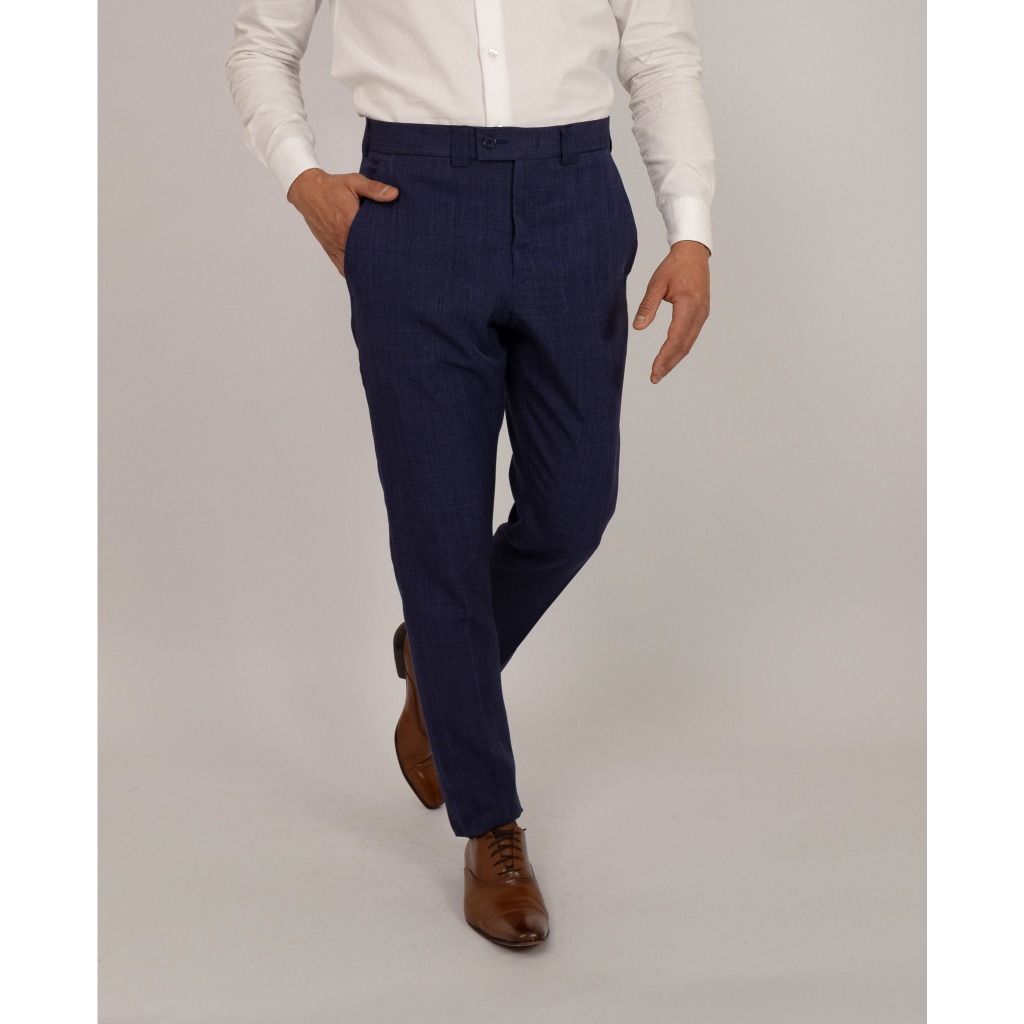 Calça Social Masculina Alfaiataria Slim Azul Marinho Textura tipo Linho, Cós Transpassado, Sem Barra