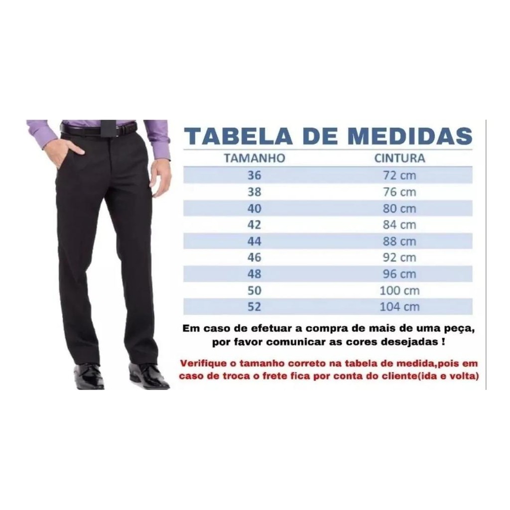 **ATENÇÃO O MELHOR PREÇO DE CALÇAS DE LUXO DO BRASIL ESTA AQUI** •Levamos ate vocês Elegância, Qualidade e os melhor preço do Brasil. •Verifique suas medidas na tabela , confira se está tudo de acordo com seu tamanho e faça já o seu pedido. •Nossas calças são enviadas direto da fabrica, vendemos no varejo a preço de atacado. •Produtos a pronta entrega; ENVIO IMEDIATO!!!! ———— TABELA DE TAMANHO DAS CALÇAS: Tamanho 36 - 71cm Cintura da Calça - 110cm Comprimento da Calça Tamanho 38 - 75cm Cintura da Calça - 111cm Comprimento da Calça Tamanho 40 - 79cm Cintura da Calça - 112cm Comprimento da Calça Tamanho 42 - 83cm Cintura da Calça - 113cm Comprimento da Calça Tamanho 44 - 87cm Cintura da Calça - 114cm Comprimento da Calça Tamanho 46 - 91cm Cintura da Calça - 115cm Comprimento da Calça Tamanho 48 - 95cm Cintura da Calça - 115cm Comprimento da Calça Tamanho 50 - 99cm Cintura da Calça - 116cm Comprimento da Calça Tamanho 52 - 103cm Cintura da Calça - 116cm Comprimento da Calça Tamanho 54 - 107cm Cintura da Calça - 116cm Comprimento da Calça ———— CARACTERÍSTICAS DO PRODUTO: - Tecido: MICROFIBRA - Composição: 100% Poliéster - Modelagem: Slim - Bolsos: 2 Bolsos Traseiros e 2 frontais - Botão: Os bolsos traseiros possuem botão ———— • Por ser modelo slim é aconselhável pedir um tamanho a mais em relação ao que você veste. • Antes de finalizar a compra, tire suas dúvidas através do campo de perguntas. • Tamanhos do 36 a 58 • Disponível nas cores Preto, Azul Marinho, Azul Royal, Cinza e Bege
