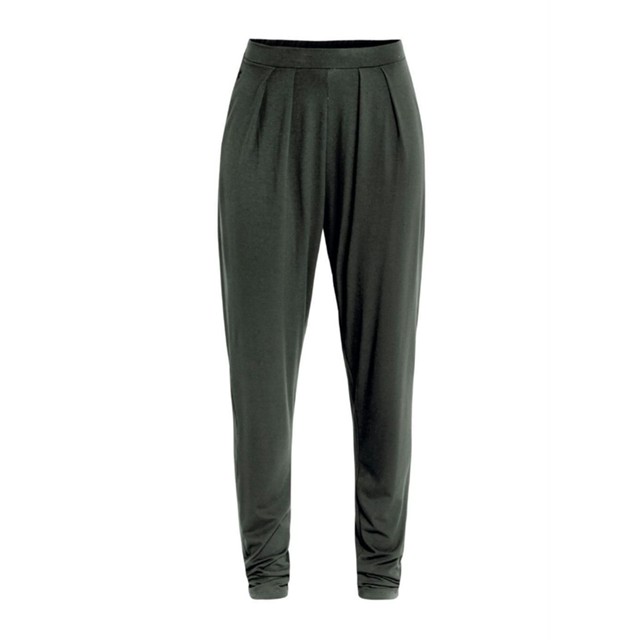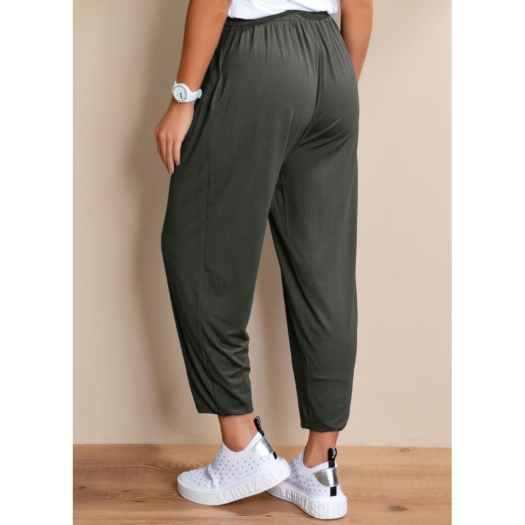 Calça em malha de viscose com elastano. Modelo soltinho, cós com elástico e pregas. Cintura média.