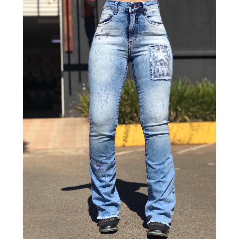 CALÇA TEX TEAM BRILHANTE - VEGAS - Modelo: Brilhante, Flare, Cintura Alta, Com Lycra. - Forma normal, cintura menor. - Brilhos de ótima qualidade. - Fica linda e valoriza o corpo. - Tomar cuidado com a lavagem. - Composição: 80% Algodão 18% Poliéster 2% Elastano