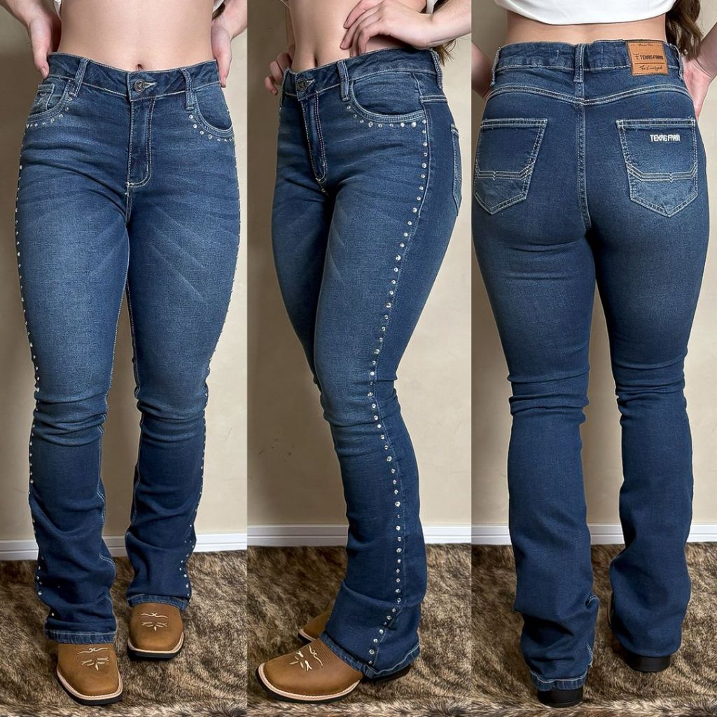 Calça Texas Farm Feminina Jeans Country Levanta Bumbum Lançamento Bordado Flare Brilho Rodeio Cós