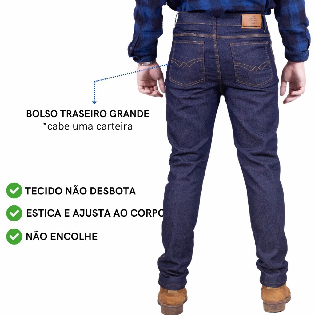 IMPORTANTE: PEDIR UM TAMANHO ACIMA Calça Jeans Masculina Com Elastano Passeio/Trabalho Com Lycra Promocional Nossa Calça Jeans Masculina Com Elastano Passeio/Trabalho Com Lycra Promocional é ideal para ser usada no dia a dia, no trabalho e em ocasiões especiais. Calça direto da fábrica, super confortável, com uma ótima modelagem e excelente caimento no corpo. COR DA CALÇA: Azul Escuro ⚠IMPORTANTE: *Não precisa abrir reclamações, em caso de devolução! - Caso o produto não sirva, pode nos chamar no chat que resolveremos para você, antes de abrir reclamações, pode ter certeza que seu problema será resolvido! ✅ESPECIFICAÇÕES: * Foto real do produto. * Veste super bem. * Alta qualidade de produção. * Ótimo caimento no corpo. * Super confortável. * Uma ótima modelagem. ⭐PORQUE COMPRAR CONOSCO? 1) Fabricação Própria; 2) Tecido de alta qualidade; 3) Entrega Extremamente Rápida; 4)A sua satisfação é o que nos mantém motivados a entregar sempre o melhor; 5) Somos referência em conforto e prestação de serviços de imensa qualidade; 6) Índice de satisfação de nossos clientes esta acima de 97%. COMPOSIÇÃO DA CALÇA: 74% Algodão 24% Poliéster 2% Elastano ENVIOS: * Enviamos para todo o Brasil; * Entrega extremamente Rápida; * Produtos a pronto entrega. DIFERENCIAIS DA CALÇA: 1) SECAGEM RÁPIDA: sua composição de 74% Algodão, 24% Poliéster, 2% Elastano, essa composição favorece a secagem, o que agiliza muito no seu dia a dia. 2) NÃO DESBOTA: o elastano não deixa desbotar e não perde sua cor gerando maior durabilidade da calça. 3) ALTA RESISTENCIA: o elastano tem maior durabilidade e deixa o jeans mais duradouro! 4) MATERIAL: não amassa e não laceia, com isso você terá mais durabilidade e conforto ao vestir! ATENÇÃO: Para garantir a durabilidade da sua calça jeans, evite lavá-la em máquinas lava e seca. O calor excessivo pode comprometer o tecido e a elasticidade, reduzindo a vida útil do produto. Lave à mão ou na máquina de lavar em ciclo delicado e deixe secar naturalmente. DÚVIDAS FREQUENTES: 1 - É recomendado pegar um tamanho maior ou menor? Resposta: Nós recomendamos comprar no tamanho utilizado normalmente, mas pedimos que se atentem a tabela de medidas disponível no anúncio para auxiliar na escolha do tamanho correto. 2 – Tem os produtos a pronta entrega? Em quanto tempo o produto será enviado? Resposta: Sim, temos todas as peças a pronta entrega para envio imediato. Após efetuar a compra, seu pedido será postado em no máximo 24 horas uteis. 3 – Preciso de várias calças porem em tamanhos diversificados. Tem como? Tem sim, é só adicionar um tamanho por vez em seu carrinho e depois fazer uma compra só. 4 – Eu preciso de tamanhos diferentes. Como fazer sem pagar vários fretes? Você precisa adicionar um tamanho por vez em seu carrinho e depois fazer uma compra só no final. 5 – O tecido é resistente? Resposta: Sim, nossas peças são fabricadas com tecidos resistentes 74% Algodão, 24% Poliéster, 2% Elastano na composição para deixar ainda mais confortável. DÚVIDAS: É só nos chamar no chat que responderemos o mais rápido possível.