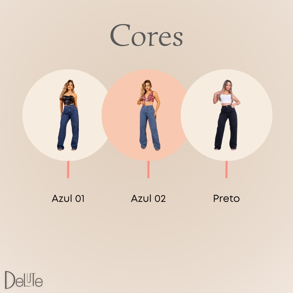 Calca Jeans Feminina Wide Leg Ref: 206 e 207 A calca jeans wide leg e a combinacao perfeita de estilo e conforto, perfeita para quem busca acompanhar as ultimas tendencias da moda. Seu design moderno e versatil, com pernas largas, proporciona um visual elegante e descolado. Alem disso, seu tecido de alta qualidade garantem um caimento perfeito e uma sensacao de liberdade ao vestir. Seja para um passeio casual ou uma ocasiao especial, essa calca e a escolha ideal para mulheres que valorizam o estilo e a praticidade. - Cintura alta - Fechamento com um botao e ziper resistente - Bolsos frontais funcionais com forro e bolsos traseiros funcionais - Barra Simples Tamanhos: 36 a 46 Composicao: 100% Algodao