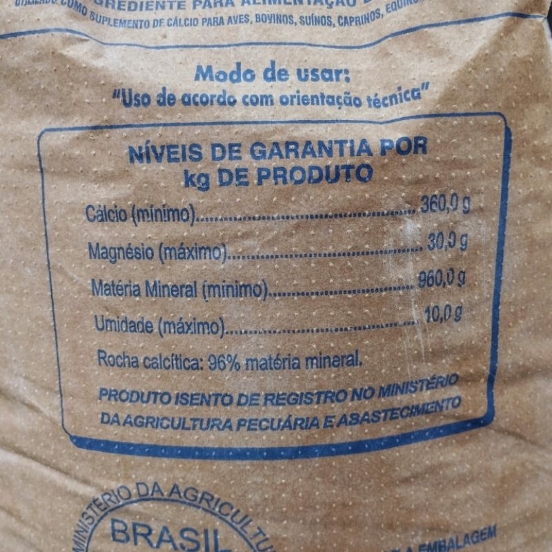 Calcário Calcítico Componente indispensável para fabricação de r@ção anim@l. O alto teor de cálcio e baixo teor de Magnésio propícia a inclusão necessária desses nutrientes, melhorando o desempenho dos animal fortalecendo os ossos e as cascas dos ovos. Apresentação 1 kg 2 kg