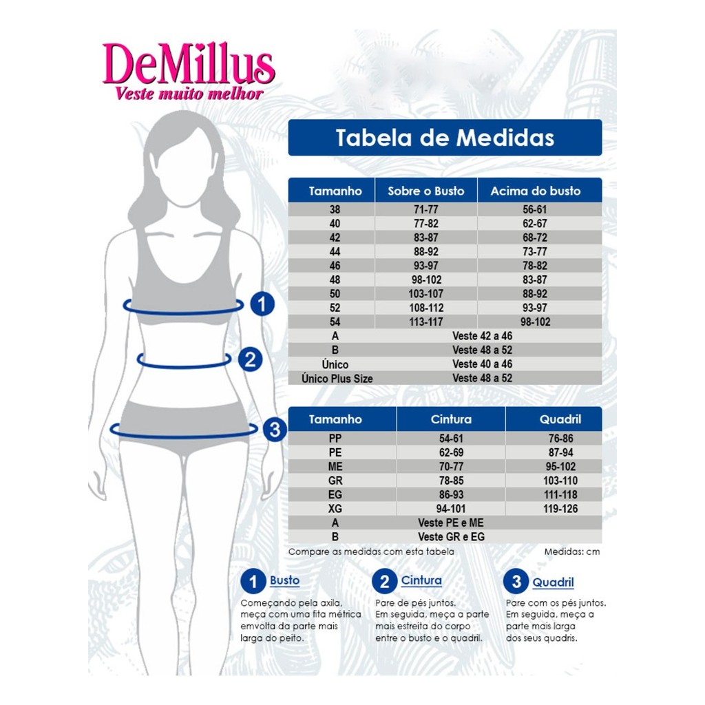 Detalhes DeMillus Calcinha calça nova Bourbon DeMillus 26406 cintura e pernas sem elástico, com acabamento em bainha larga muito conforto Tabela de Medidas: Tamanho Cintura Quadril PP 54 a 61cm 76 a 86cm PE 62 a 69cm 87 a 94cm ME 70 a 77cm 95 a 102cm GR 78 a 85cm 103 a 110cm EG 86 a 93cm 111 a 118cm XG 94 a 101cm 119 a 126cm Características: Calcinha modelagem alta Cintura e pernas sem elástico Com acabamento em bainha larga Atende tamanho Plus Size Composição: Corpo: 83% Poliamida e 17% Elastano Forro: 100% Algodão