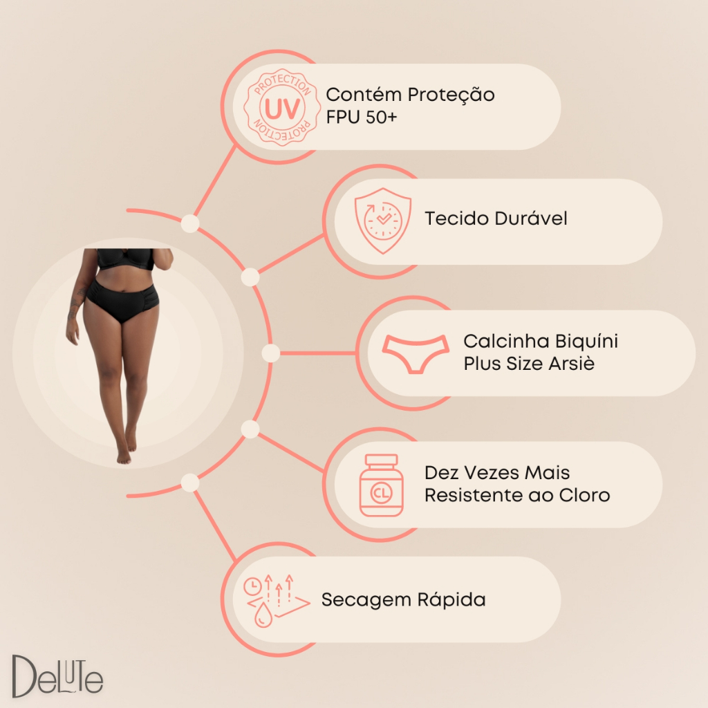 Biquíni Plus Size Parte de Baixo Tanga Arsiè Ref: AS5095 A calcinha de biquíni plus size feminina da Arsiè vem com uma lateral drapeada e cintura alta. O detalhe drapeado na lateral realça a cintura e auxilia na camuflagem de imperfeições, representando ainda uma tendência na moda praia. É uma escolha excelente para quem deseja conforto, estilo e segurança para desfrutar do verão. Este modelo é confortável, moderno e muito valorizado pelas mulheres, pois adapta-se ao corpo e modela a cintura de forma lateral. - Modelagem anatômica para um ajuste perfeito. - Proporciona um encaixe ideal ao corpo. - Drapeado na lateral. - Lateral ampla. - Tamanho Plus Size. Composição: Tecido: Poliéster 85% Forro: Poliéster 90%