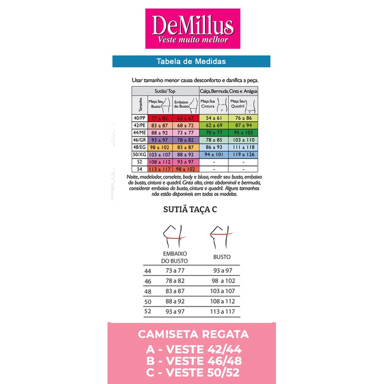 Detalhes DeMillus Calcinha Biquíni Virtuel DeMillus 16498 Confortável e não marca. Em microfibra elástica Plus. Adere no corpo, sem elástico nas cavas. Confortável e não marca sob a roupa justa. Tecido especial com Lycra® e Tactel. Características: Calcinha em microfibra produzida com fio Lycra®.Sem elástico nas pernas.Adere ao corpo como uma segunda pele.Por isso não marca, mesmo sob roupa justas.Confortável e invisível.Modo de Lavagem: Lavar com sabão neutro e água fria.Enxaguar até eliminar todo o resíduo de sabão.Não deixe de molho.Secar a sombra.Não passar a ferro.Composição: Corpo: 86% Poliamida e 14% Elastano.Forro: 100% Algodão.