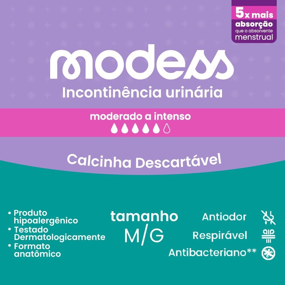 Indicado para incontinência urinária moderado a intenso. Tamanhos M/G - Quadril: 100 - 110 cm Os produtos são válidos por 2 (dois) anos após data de fabricação se mantidos fechados em locais secos. As Calcinhas descartáveis Modess Incontinência, foram desenvolvidas pensando no bem estar da mulher, com a função 2 em 1, absorvendo e retendo a urina e menstruação, proporcionando proteção contra vazamentos, apresenta a tecnologia respirável para evitar abafamentos durante o uso, tecnologia antibacteriano reduzindo o crescimento de microrganismo, tecnologia antiodor permitindo a neutralização e controle do odor, com fios elásticos garantindo ajuste ao corpo, cobertura suave e macia proporcionando conforto durante o uso.