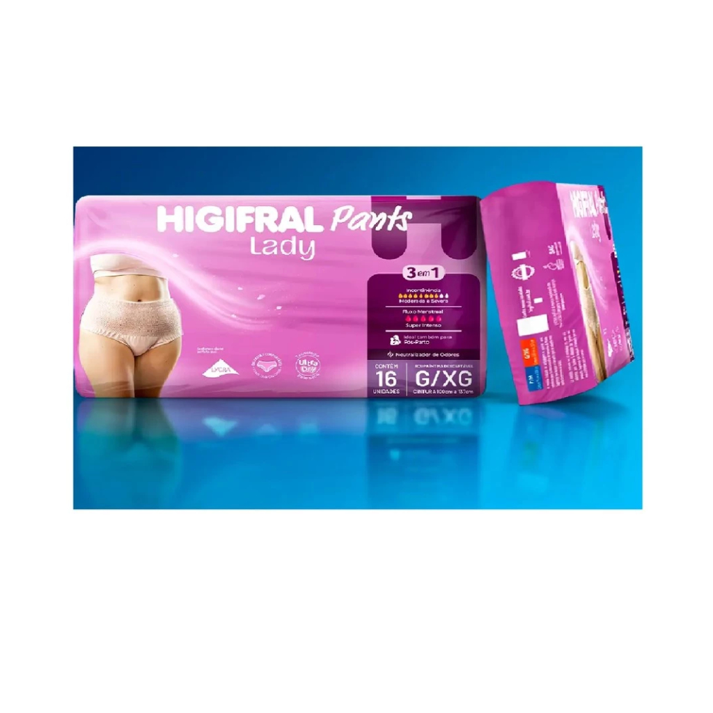 Calcinha Roupa Íntima Descartável Higifral Pants Lady G/XG – 16 Unidades A Higifral Pants Lady G/XG foi criada para oferecer conforto, discrição e segurança durante todo o dia. Com modelagem anatômica, veste como uma calcinha comum, proporcionando ajuste perfeito, liberdade de movimentos e máxima praticidade. Indicada para quem precisa de proteção contra incontinência leve a moderada, sua camada absorvente retém líquidos rapidamente, mantendo a pele seca e ajudando a evitar irritações. Feita com material macio, respirável e suave ao toque, garante bem-estar prolongado em qualquer situação. Perfeita para o dia a dia, viagens, atividades ao ar livre e momentos que exigem mais segurança. ✨ Diferenciais do Produto ✔️ Ajuste tipo calcinha — confortável, discreto e seguro ✔️ Ideal para incontinência leve a moderada ✔️ Alta absorção com proteção prolongada ✔️ Material macio, respirável e gentil com a pele ✔️ Modelagem anatômica que se adapta ao corpo ✔️ Fácil de vestir e descartar ✔️ Contém 16 unidades ✔️ Tamanho G/XG