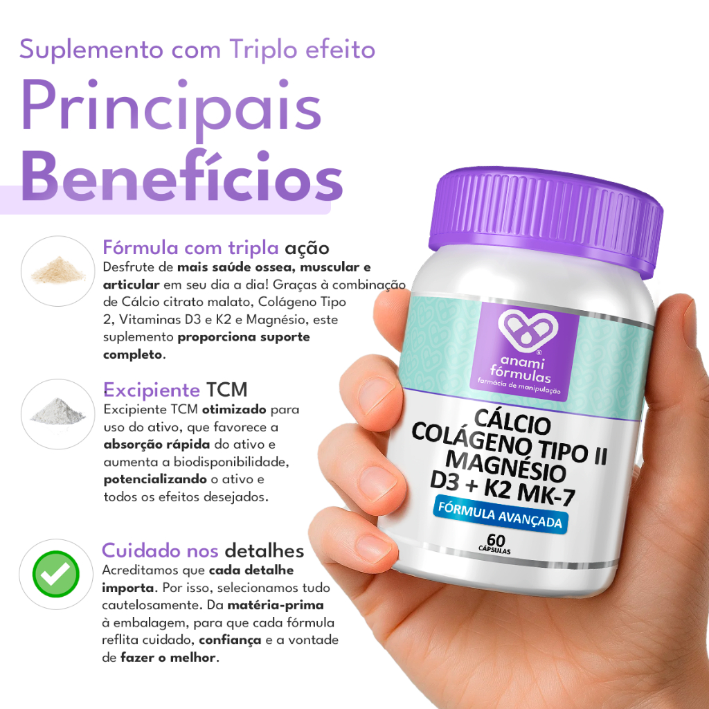 Com ampla experiência no setor de manipulação magistral, nossa farmácia preza pela qualidade, segurança e rigor científico em cada formulação. Todos os nossos produtos são desenvolvidos a partir de matérias-primas certificadas, submetidas a rigorosos processos de controle e análise para garantir máxima eficácia e segurança aos nossos clientes. Se você está buscando um suplemento manipulado com Cálcio, Colágeno Tipo II, Magnésio e Vitaminas D3 e K2, saiba que trabalhamos com matérias-primas de procedência confiável e seguimos padrões rigorosos de qualidade. Imagem ilustrativa: a cor da cápsula pode variar conforme a disponibilidade. Saúde Óssea e Articular Nossa formulação combina nutrientes essenciais que auxiliam na manutenção da saúde dos ossos, músculos e articulações. O Cálcio Citrato Malato é conhecido por sua alta biodisponibilidade, contribuindo para a formação e manutenção de ossos fortes. O Colágeno Tipo II não desnaturado auxilia na manutenção da função articular, promovendo maior flexibilidade e conforto nas articulações. O Magnésio e as Vitaminas D3 e K2 desempenham papéis fundamentais no funcionamento muscular e na fixação adequada do cálcio nos ossos, respectivamente. Diferenciais da Nossa Farmácia Rigoroso controle de qualidade: Garantimos a pureza e a eficácia de cada produto manipulado. Matérias-primas certificadas: Utilizamos ingredientes de fornecedores aprovados e reconhecidos. Precisão nas dosagens: Asseguramos que cada cápsula contenha a quantidade exata dos nutrientes necessários. Profissionais altamente capacitados: Nossa equipe é composta por especialistas comprometidos com a excelência. Laudos técnicos e análises laboratoriais: Realizamos testes que confirmam a estabilidade e a qualidade de nossos produtos. Principais Benefícios do Suplemento Fortalecimento ósseo: Contribui para a formação e manutenção de ossos saudáveis. Saúde articular: Auxilia na manutenção da flexibilidade e conforto das articulações. Funcionamento muscular adequado: Participa ativamente na saúde e desempenho dos músculos. Melhora da flexibilidade corporal: Promove maior mobilidade e qualidade de vida. Auxílio na fixação do cálcio: As Vitaminas D3 e K2 facilitam a correta deposição de cálcio nos ossos. Indicações de Uso Este suplemento é recomendado para indivíduos que buscam: Manter ou melhorar a saúde óssea. Apoio na saúde das articulações e músculos. Prevenir deficiências nutricionais relacionadas aos componentes da fórmula. Composição Cálcio 250mg Colágeno Tipo II não desnaturado 1,6mg Magnésio 63mg Vitamina D3 25µg Vitamina K2 50µg Excipiente q.s.p. Modo de Uso Tomar 1 cápsula ao dia, preferencialmente junto com uma das refeições, ou conforme orientação de um profissional de saúde. Compromisso com a Qualidade Desenvolvimento técnico e rigor científico em todas as etapas. Controle de qualidade criterioso, assegurando confiabilidade. Utilização de matérias-primas de alta pureza e certificadas. Processo de manipulação conforme normas e boas práticas farmacêuticas. Advertências e Precauções Este produto é um suplemento manipulado e deve ser utilizado apenas sob orientação profissional. Não substitui uma alimentação equilibrada e um estilo de vida saudável. Contraindicado para gestantes, lactantes e menores de 18 anos sem orientação profissional. Armazene em local seco e arejado, protegido da luz e umidade. Perguntas Frequentes Quem pode tomar este suplemento? Indivíduos que buscam suporte na saúde óssea, articular e muscular. Recomenda-se consultar um profissional de saúde antes de iniciar o uso. Como devo armazenar o produto? Armazene em local seco e arejado, protegido da luz e umidade, para garantir sua estabilidade e eficácia. O produto possui efeitos colaterais? Os efeitos podem variar de pessoa para pessoa. Em caso de reações adversas, suspenda o uso e procure orientação profissional. O produto é manipulado? Sim, nossos suplementos são manipulados seguindo todas as exigências sanitárias, garantindo qualidade e segurança. Este suplemento auxilia na saúde das articulações? Sim, a presença do Colágeno Tipo II não desnaturado contribui para a manutenção da função articular, promovendo maior flexibilidade e conforto. Qual a diferença entre este suplemento manipulado e os industrializados? Nossos produtos manipulados são personalizados e preparados sob medida, permitindo ajustes conforme as necessidades individuais, sempre seguindo rigorosos padrões de qualidade.