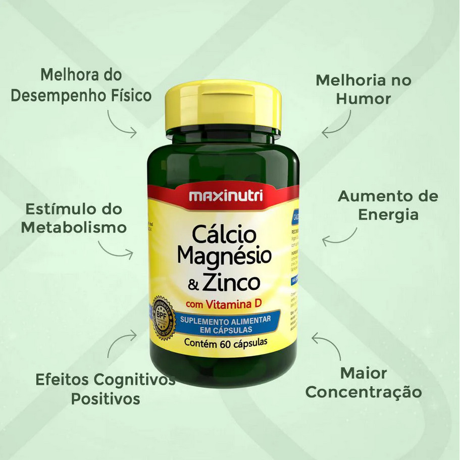 Cálcio + Magnésio + Zinco + Vit D 60 Caps Maxinutri ENVIO IMEDIATO!!! O Cálcio + Magnésio + Zinco + Vit. D 60 Caps Maxinutri Sabor Sem Sabor é um suplemento nutricional da marca Maxinutri, desenvolvido para fornecer os minerais essenciais para o corpo. Com ingredientes como carbonato de cálcio, carbonato de magnésio, vitamina D e zinco, este produto é uma excelente opção para complementar a alimentação diária. As cápsulas são livres de glúten e contêm antiumectante dióxido de silício, corante dióxido de titânio e gelatina na composição. Com um peso líquido de 38g, cada porção contém 1,87g. O kit vem com 60 unidades, proporcionando um suprimento para um longo período.Este suplemento é recomendado para pessoas a partir de 9 anos de idade e é ideal para quem busca manter uma alimentação equilibrada e saudável. Além disso, o formato em cápsulas facilita o consumo diário, garantindo praticidade e conveniência.Com embalagem em pote, o uso recomendado é nutricional, podendo ser incorporado à rotina alimentar de forma simples. O Cálcio + Magnésio + Zinco + Vit. D 60 Caps Maxinutri Sabor Sem Sabor é uma ótima opção para quem busca suplementar sua dieta com minerais essenciais, contribuindo para uma vida mais saudável e equilibrada.