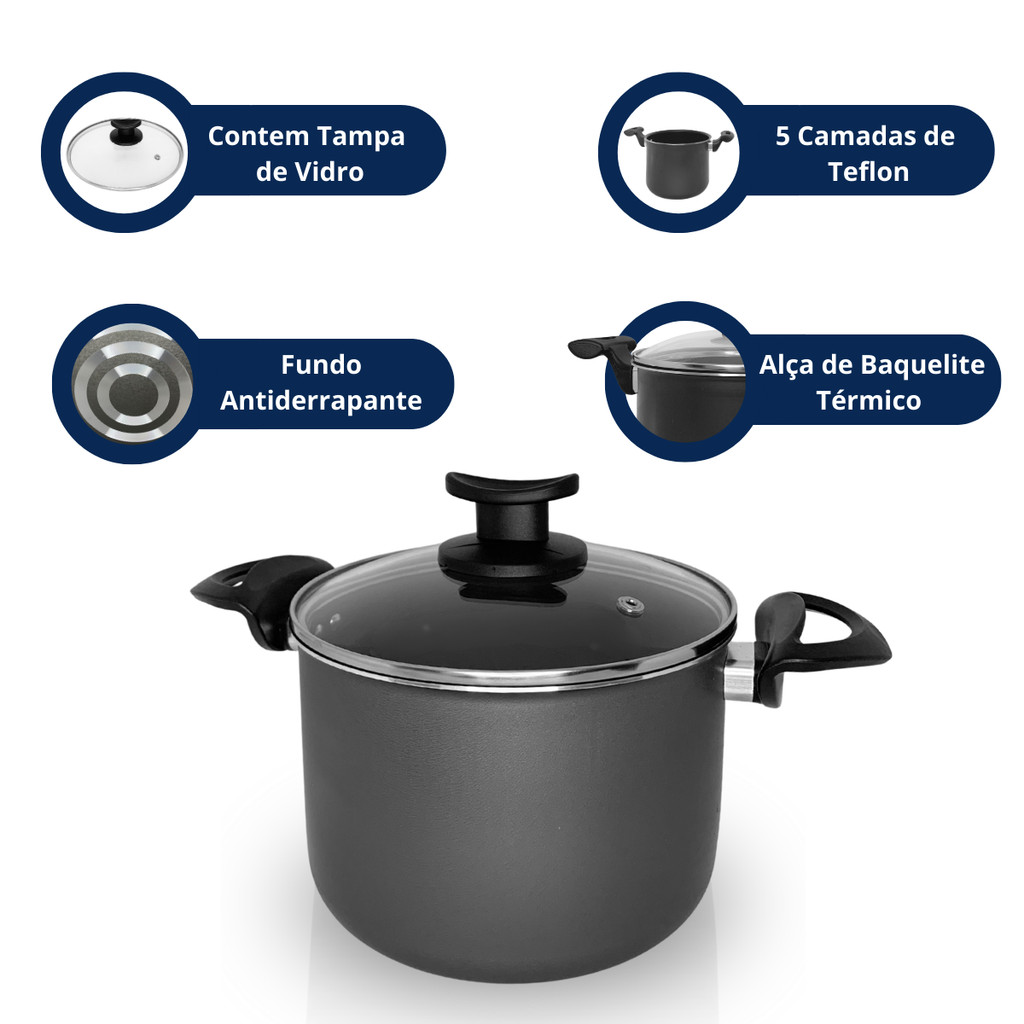 Caldeirão Antiaderente Grafite 18 cm com Tampa de Vidro Descrição Geral Caldeirão produzido em alumínio de alta qualidade com revestimento interno e externo em teflon antiaderente de 5 camadas que oferece resistência durabilidade e facilidade de limpeza. Indicado para preparos do dia a dia como arroz feijão sopas caldos legumes carnes e molhos em quantidades ideais para famílias pequenas ou uso individual. Capacidade e Medidas Este caldeirão possui diâmetro de 18 cm altura de 12,5 cm e capacidade de 3,1 litros sendo compacto prático e perfeito para receitas menores que exigem eficiência e rapidez no cozimento. Revestimento Antiaderente O revestimento em teflon com 5 camadas evita que os alimentos grudem mesmo com pouco óleo garantindo praticidade na hora de cozinhar e facilitando a limpeza após o uso. Espessura Reforçada Com espessura de 1,6 mm o caldeirão distribui o calor de forma uniforme proporcionando um cozimento rápido econômico e preservando melhor o sabor e os nutrientes dos alimentos. Tampa de Vidro A tampa de vidro temperado possibilita acompanhar o cozimento sem necessidade de abrir mantendo o calor interno e garantindo mais praticidade durante o preparo. Alças Resistentes ao Calor As alças de baquelite térmico oferecem maior segurança conforto e firmeza no manuseio mesmo em altas temperaturas. Fundo Antiderrapante Possui fundo antiderrapante que garante estabilidade no fogão proporcionando mais segurança durante o preparo das refeições. Cor Moderna Com acabamento em grafite este caldeirão une praticidade e design moderno deixando sua cozinha ainda mais funcional e elegante. Versatilidade de Uso Compatível com fogões a gás elétricos e vitrocerâmicos atendendo diferentes necessidades no preparo de receitas variadas. Benefícios Praticidade no uso diário Durabilidade com 5 camadas de teflon Fácil de limpar e conservar Ideal para famílias pequenas ou uso individual Design moderno e funcional