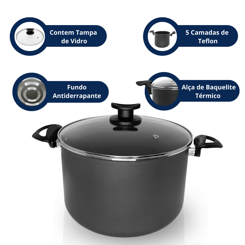 Caldeirão Antiaderente Grafite 26 cm com Tampa de Vidro Descrição Geral Caldeirão de alta qualidade produzido em alumínio com revestimento interno e externo em teflon antiaderente de 5 camadas que garante maior resistência durabilidade e facilidade na limpeza. Ideal para preparar receitas do dia a dia como arroz feijão macarrão sopas caldos ensopados legumes e carnes. Capacidade e Medidas Este caldeirão possui diâmetro de 26 cm altura de 17 cm e capacidade de 7,4 litros sendo perfeito para famílias maiores e preparos em grande quantidade. Revestimento Antiaderente O revestimento em teflon com 5 camadas proporciona maior proteção evitando que os alimentos grudem mesmo com pouco óleo facilitando o cozimento e deixando a limpeza rápida e prática. Espessura Reforçada Com espessura de 1,3 mm o caldeirão distribui o calor de forma uniforme permitindo que os alimentos cozinhem por igual economizando gás e preservando os nutrientes. Tampa de Vidro A tampa de vidro temperado permite visualizar os alimentos durante o preparo sem a necessidade de abrir a panela ajudando a manter o calor interno e o sabor dos pratos. Alças Resistentes ao Calor As alças são produzidas em baquelite térmico garantindo segurança e firmeza no manuseio mesmo em altas temperaturas. Fundo Antiderrapante Conta com fundo antiderrapante que garante maior estabilidade no fogão proporcionando mais segurança no uso. Cor Moderna Na cor grafite este caldeirão combina modernidade e praticidade se tornando um item indispensável para a sua cozinha. Versatilidade de Uso Pode ser utilizado em fogões a gás elétricos e vitrocerâmicos atendendo diferentes necessidades no preparo de suas receitas. Benefícios Praticidade no dia a dia Durabilidade com 5 camadas de teflon Fácil de limpar e conservar Ideal para famílias grandes Design moderno e funcional