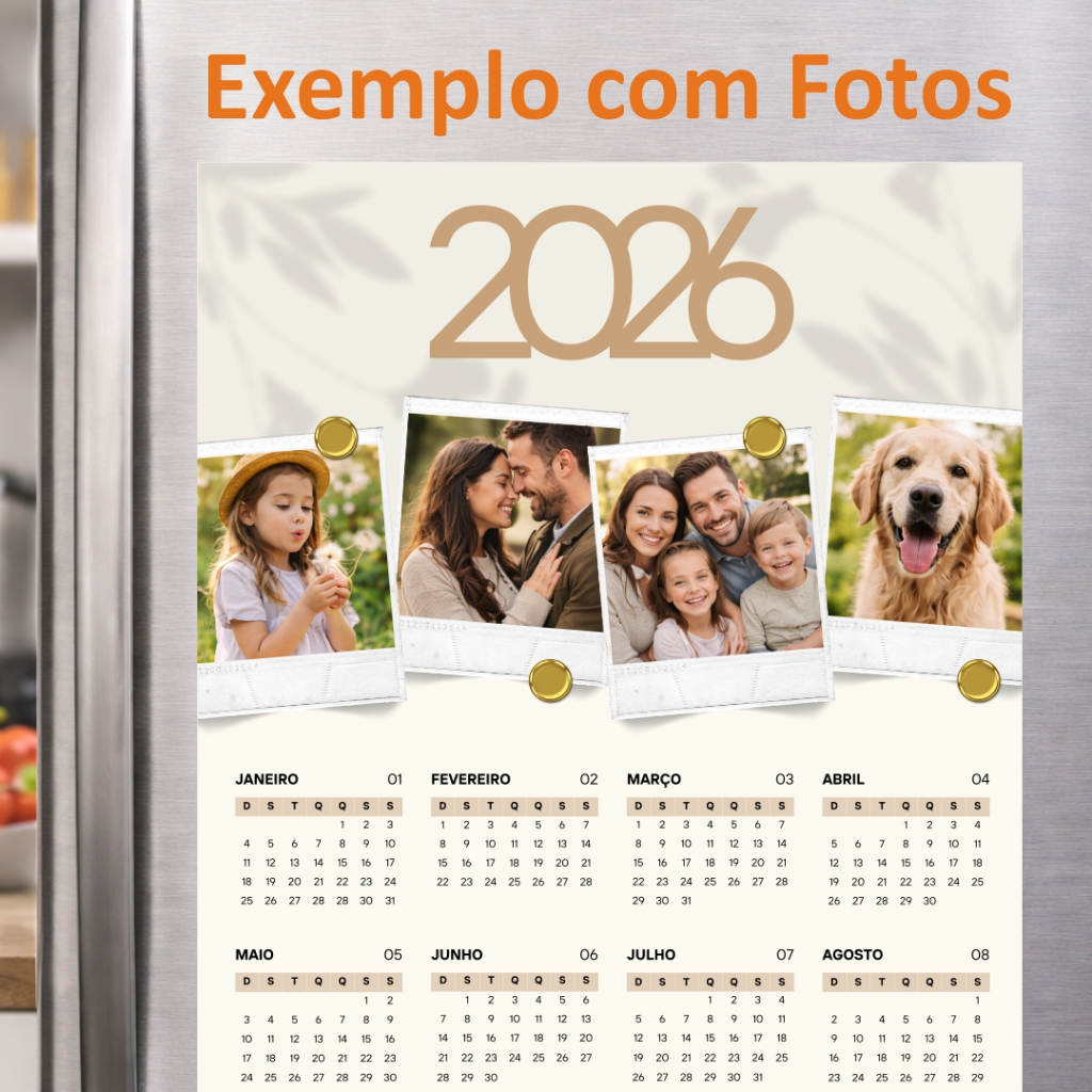 📅 Calendário 2026 Ímã de Geladeira Personalizado A4 - Premium Organize seu ano com estilo e afeto. Calendário A4 imantado, personalizado com 4 fotos, ideal para decorar sua geladeira e manter os melhores momentos sempre à vista. ✨ Características do Produto ✔ Calendário 2026 ✔ Ímã de geladeira (fixação firme) ✔ Tamanho A4 (21 x 29,7 cm) ✔ Personalização com 4 fotos ✔ Design clean e premium ✔ Impressão de alta qualidade 🎨 Personalização 📸 O cliente envia 4 fotos após a compra pelo chat As fotos são aplicadas exatamente no layout apresentado 🧲 Material • Papel de alta gramatura • Ímã resistente no verso • Produto enviado pronto para uso ⚠️ Informações Importantes • A produção inicia após o envio das 4 fotos • Verifique a qualidade das imagens antes do envio • Fotos em formato quadrado são preferíveis • As cores podem variar levemente conforme a tela 🎁 Ideal para: • Casa e cozinha • Presente criativo e afetivo • Começar o ano com organização 📩 Em caso de dúvidas, fale com a gente pelo chat antes da compra.