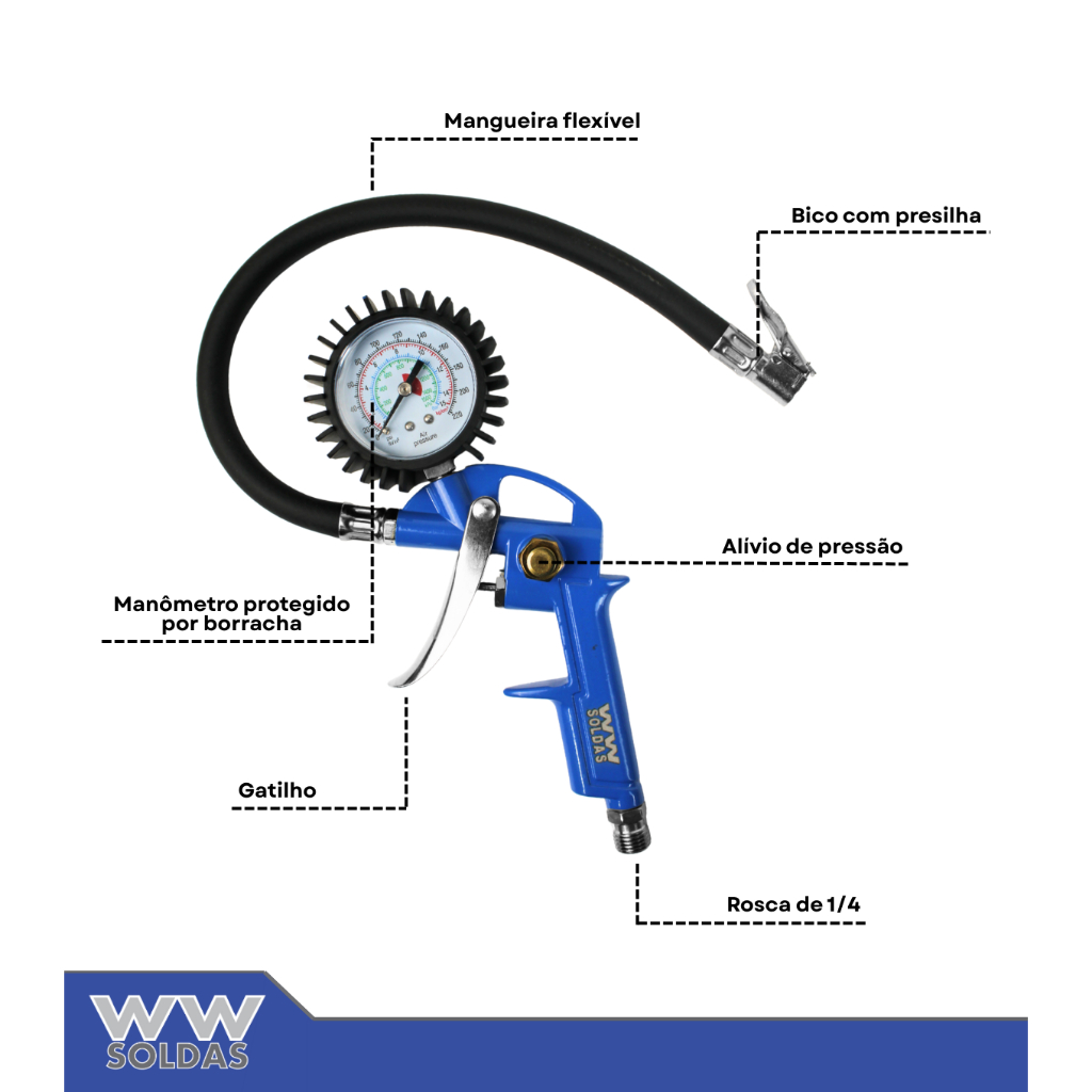 DESCRIÇÃO DO PRODUTO - Escala PSI - Prático e funcional - Pistola de alumínio e ferro - Bico prendedor com trava - Tubo de cloreto de polivinila - Capacidade: 220 libras - 15BAR - Com inflador e manômetro para compressor com reservatório PRINCIPAIS CARACTERÍSTICAS - Gatilho para inflar e botão para alivio de pressão - Manômetro para aferição de pressão de polipropileno e poliestileno - Calibrador com gatilho para fazer medição na mão, direto no pneu, com opção de encher ou esvaziar Aplicações - Mecânicos - Borracheiros - Vendedores de pneus e rodas DADOS TÉCNICOS - Peso: 275gr - Diâmetro do manômetro: 50mm - Comprimento da mangueira: 350mm