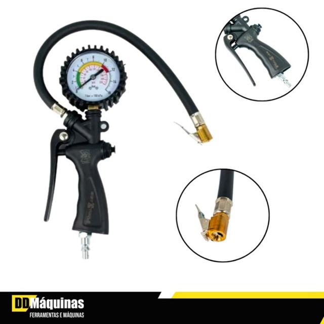 SEJA BEM VINDO A DD MÁQUINAS. CARACTERÍSTICAS• Tipo pistola;• Corpo em nylon;• Mangueira flexível e bico presilha;• Entrada de ar 1/4” NPT;• Com nipple modelo aro 1/4” instalado;• Manômetro com proteção de borracha anti-queda;• Faixa de leitura de 0 à 220 PSI – 0 à 16 BAR. APLICAÇÃO• Encher, esvaziar e calibrar pneus com ergonomia e facilidade de uso;• Suporta o uso frequente em diferentes ambientes. VANTAGENS• Processo de calibragem rápido e eficiente;• Mangueira flexível, permitindo fácil acesso à válvula do pneu;• Ótima vedação, evitando vazamentos.TERMOS DE COMPRA1 - Entrega via Shopee por transportadora.2 - Prazo de Postagem é de até 48hs, validos apenas para dias úteis após a compra.3 - O prazo de entrega informado no ato da compra é apenas um prazo estimado e não leva em consideração o prazo de postagem (item 2), podendo haver atrasos por parte da transportadora.O prazo de entrega informado é feito pela Transportadora da Shopee e não por nós. Faça o acompanhamento da sua compra para se certificar que nós postamos o seu produto no prazo informado no item 2.4 - Todas as imagens são meramente ilustrativas;5 - Caso o endereço esteja incorreto, o produto irá voltar e o pagamento será devolvido.6 - É importante que se for necessário escolher alguma variação, escolha o Tamanho/ Modelo / Cor / Voltagem imediatamente7 - Nossos produtos são originais e acompanham nota fiscalGarantia de 90 dias pelo fabricanteImagens meramente ilustrativas