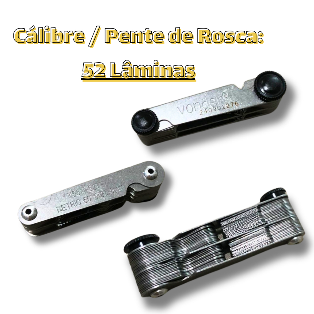 Cálibre/pente De Rosca Com 52 Lâminas, 0,25 Mm - 6,0 Mm - Vonder - Medidor de Passo ITENS INCLUSOS: 1 Cálibre/pente de rosca MATERIAL: Aço carbono MEDIDAS: Capacidade do calibre de rosca (pol): rosca polegada 55° de 62 até 4 fios por polegada (62fpp - 60fpp - 48fpp - 40fpp - 36 fpp - 32fpp - 30fpp - 28fpp - 26fpp - 25fpp - 24fpp - 22fpp - 20fpp - 19fpp - 18fpp - 16fpp - 14fpp - 13fpp - 12fpp - 11fpp - 10fpp - 9fpp - 8fpp - 7fpp - 6fpp - 5fpp - 4,5fpp - 4fpp) Capacidade do calibre de rosca (mm): rosca métrica 60° com passo de 0,25 mm até 6,0 mm (0,25 mm - 0,30mm - 0,40mm - 0,45mm - 0,50mm - 0,60mm - 0,70mm - 0,75mm - 0,80mm - 0,90mm - 1,00mm - 1,25mm - 1,50mm - 1,75mm - 2,00mm - 2,5mm - 3,00mm - 3,5mm - 4,0mm - 4,5mm - 5,0mm - 5,5mm - 6,0mm) MARCA: Vonder