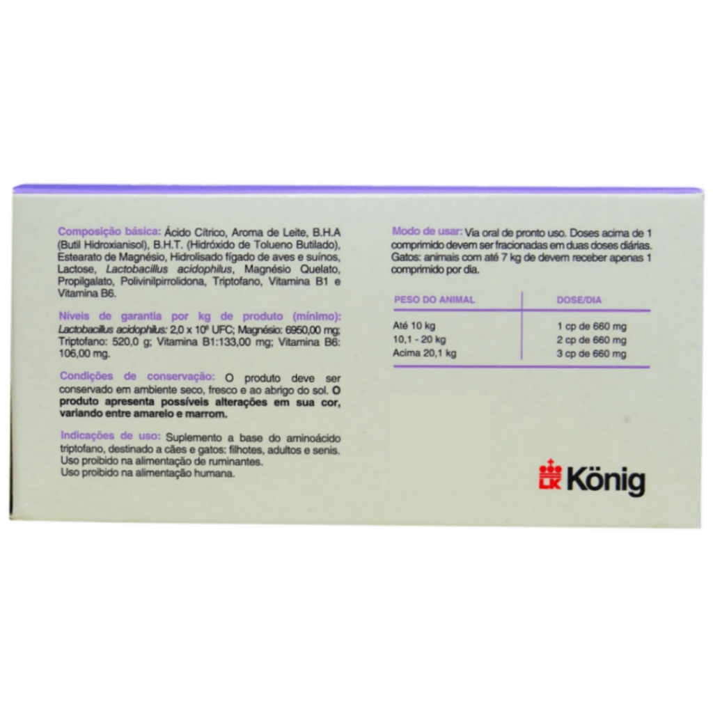 PRODUTO ORIGINAL COM NOTA FISCAL! - - - - - DESCRIÇÃO: Maior concentração de Triptofano disponível: aminoácido essencial precursor da serotonina, considerada principal neurotransmissor modulador das atividades psíquicas e responsável pela sensação de bem-estar. Vitamina B1 (tiamina), Vitamina B6 (piridoxina) e Magnésio: participam de importantes processos metabólicos do sistema nervoso central. A deficiência destes nutrientes pode causar alterações no comportamento do animal. Modo de uso: A dosagem diária (comprimido/dia) deve seguir a tabela de dose/peso e pode ser fracionada no período de 24hs. Discutir cada caso e tempo de administração do suplemento junto ao seu veterinário. - - - - - Enviamos o seu pedido o quanto antes possível! Obrigado pela preferência.