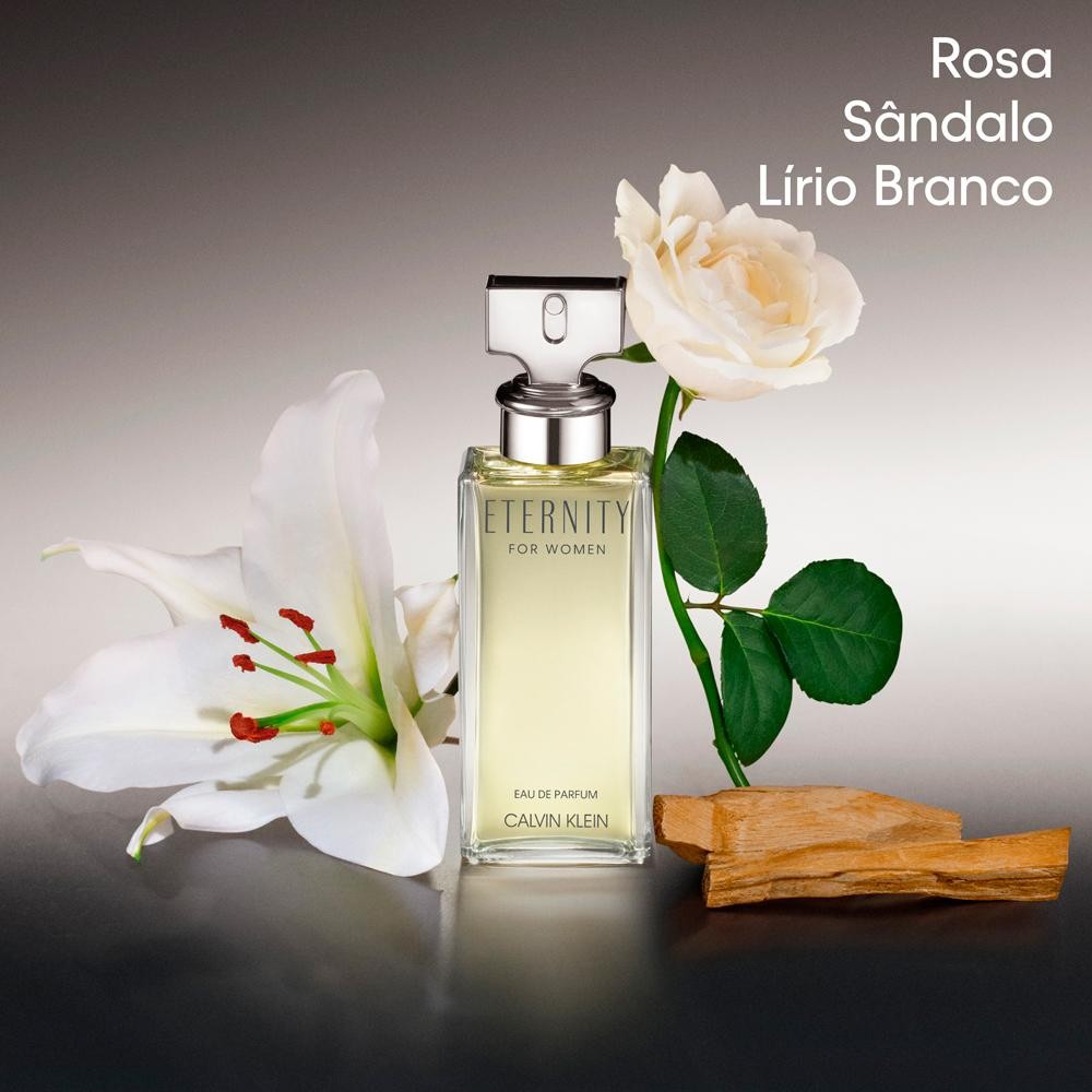 O Perfume Eternity Feminino Calvin Klein Eau de Parfum é um clássico da perfumaria internacional e sua criação foi inspirada nos romances modernos. Sua fragrância floral contém uma elegância atemporal e reúne notas sedutoras e quentes da rosa e da flor de cravo, notas de musk e madeiras, que fazem a harmonia dessa composição moderna e elegante. Uma fragrância feminina clássica para mulheres contemporâneas. Um floral romântico e sofisticado que exala o frescor das notas cítricas, como da bergamota e da mandarina, em seguida surgem flores transparentes, como o lírio branco, que se deleitam num corpo de flores mais opulentas e sedutoras, como o cravo e a rosa. O seu fundo compõe notas de madeiras envolventes, como o sândalo, e a sensualidade do musk e do âmbar. * OBSERVAÇÕES: Imagem Meramente Ilustrativa * ITENS INCLUSOS: 1 Calvin Klein Eternity Eau de Parfum Perfume Feminino 30ml